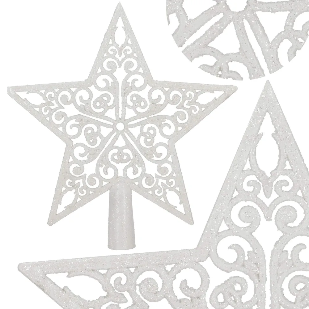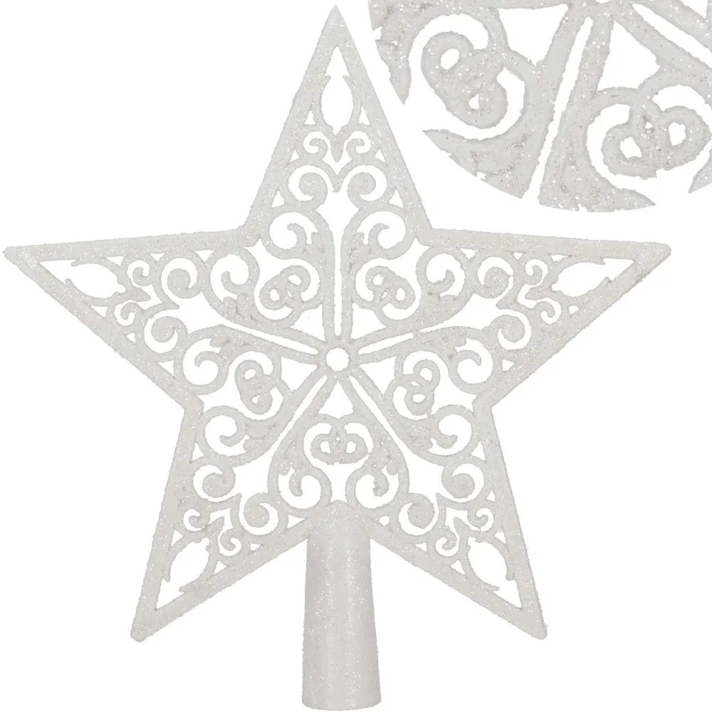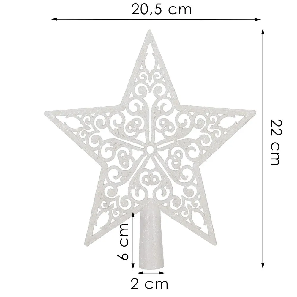 Prekrásne trblietavá hviezda na špičku vianočného stromčeka. Bohato zdobená a prelamovaná pre jedinečné kúzlo a lesk každého stromčeka. Výška 22 cm, nerozbitný materiál, farba biela. Nádherná ozdoba vianočného stromčeka na navodenie príjemnej sviatočnej atmosféry.