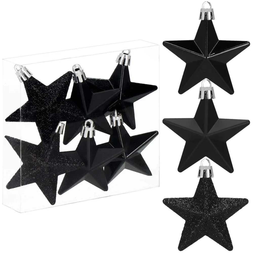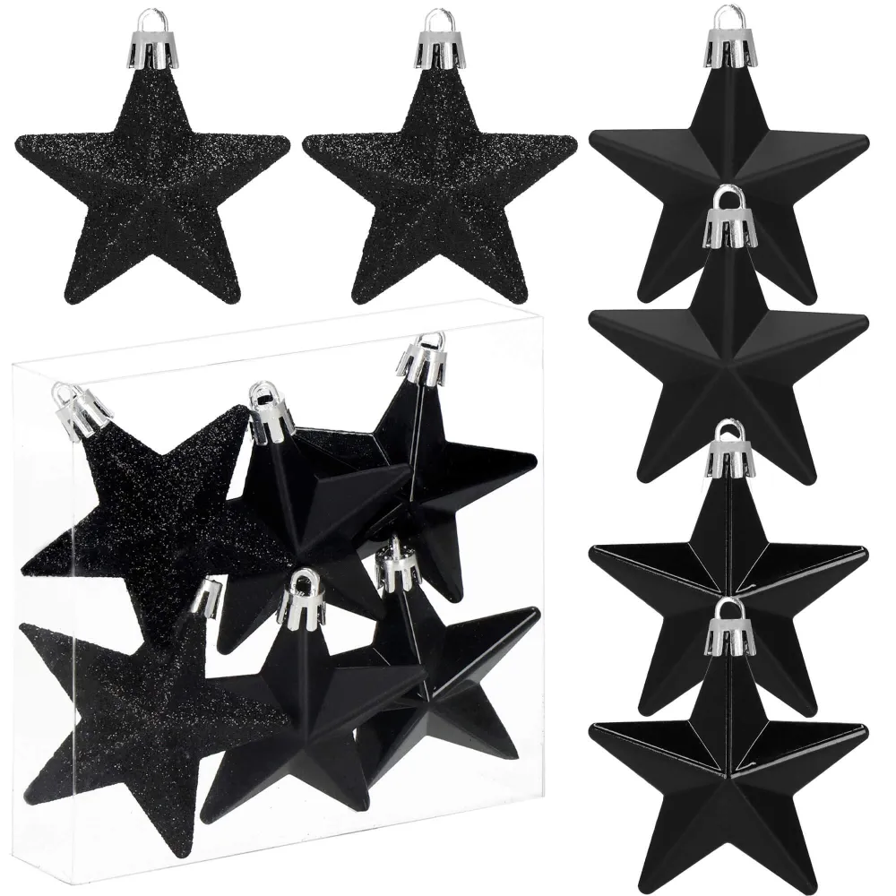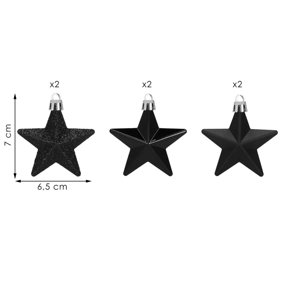 Sada 6 ks čiernych ozdôb na stromček s motívom hviezdy. Výška ozdoby 7 cm, v troch rôznych prevedeniach, pútko na zavesenie, nerozbitný plastový materiál. Ideálne na výzdobu stromčeka alebo ako vianočné dekorácie. Zadarmo povrázky pre ľahké zavesenie.