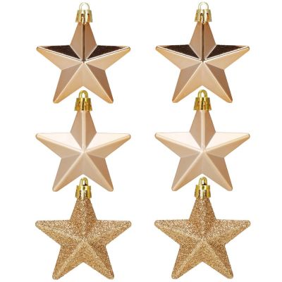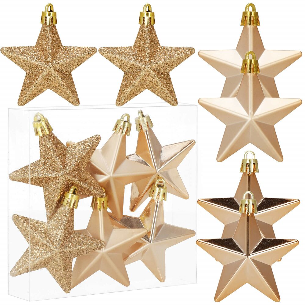 Súprava 6 ks zlatých ozdôb na stromček s motívom hviezdy. Výška ozdoby 7 cm, s tromi vzormi, pútko na zavesenie, nerozbitný plastový materiál. Ideálne na výzdobu stromčeka alebo ako vianočné dekorácie. Zadarmo povrázky pre ľahké zavesenie.