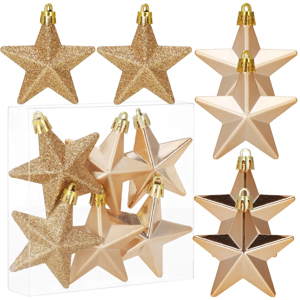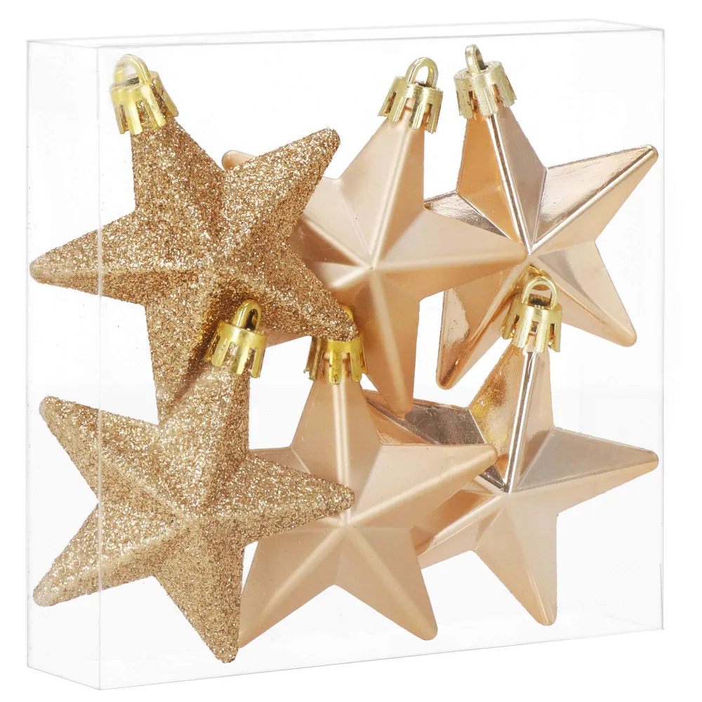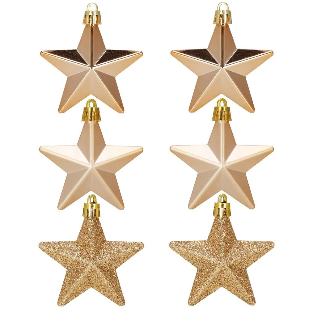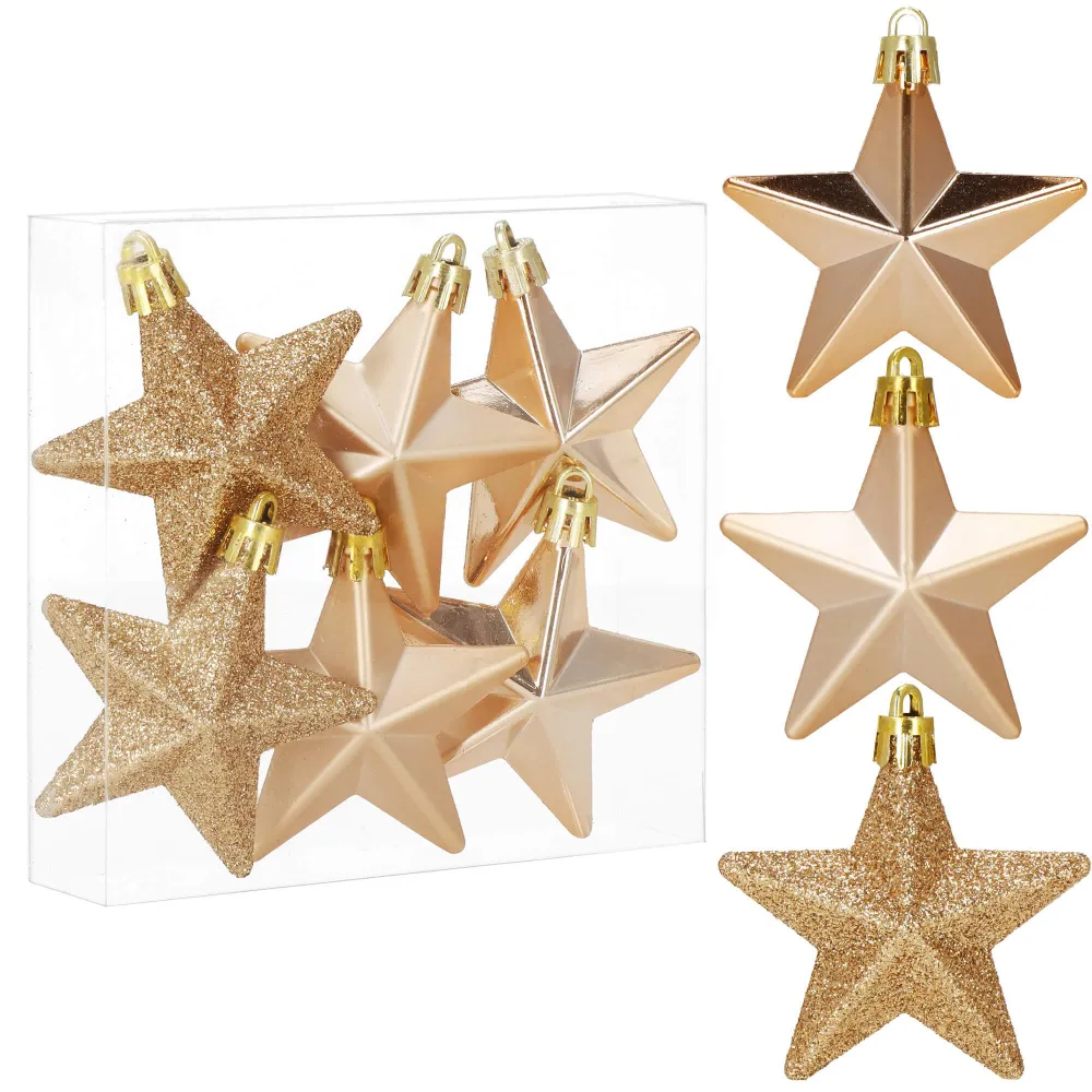 Súprava 6 ks zlatých ozdôb na stromček s motívom hviezdy. Výška ozdoby 7 cm, s tromi vzormi, pútko na zavesenie, nerozbitný plastový materiál. Ideálne na výzdobu stromčeka alebo ako vianočné dekorácie. Zadarmo povrázky pre ľahké zavesenie.
