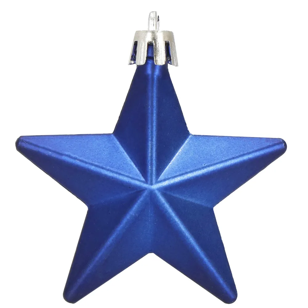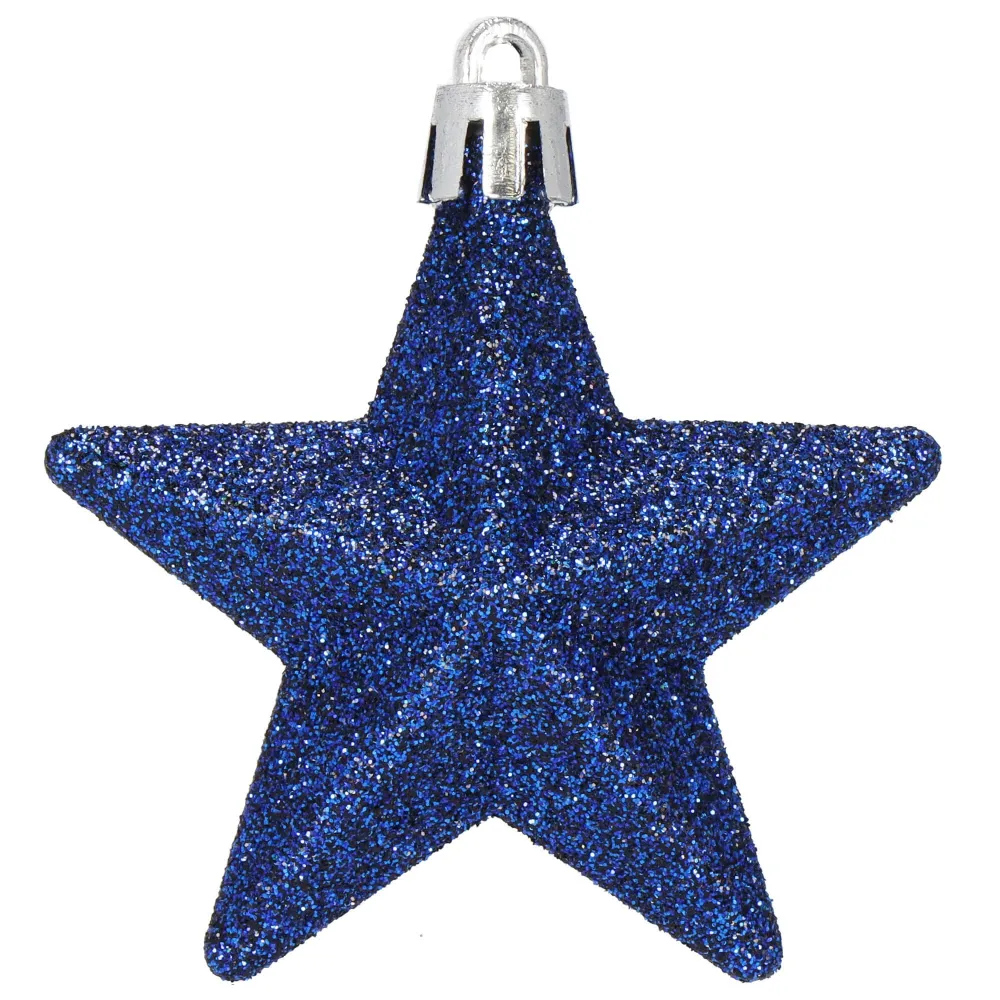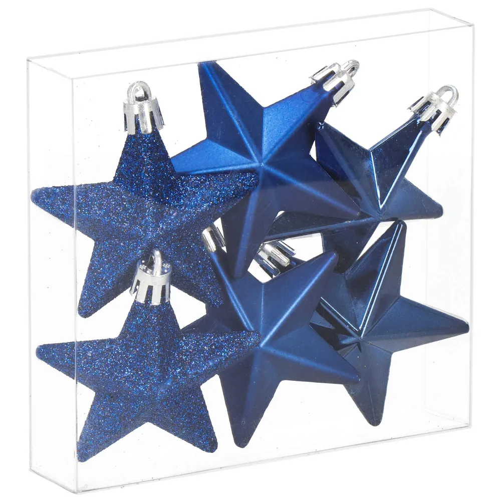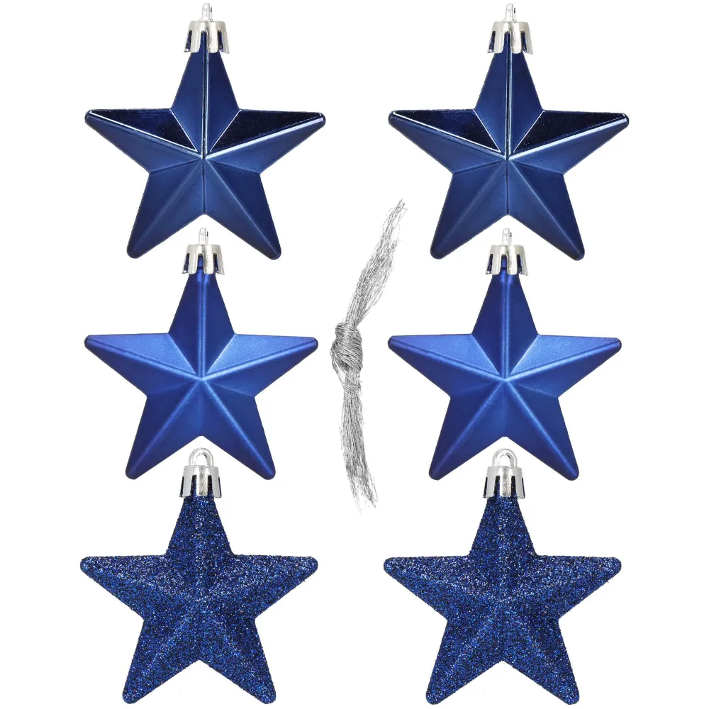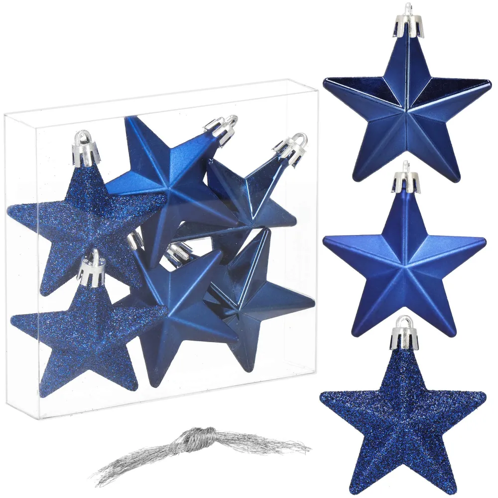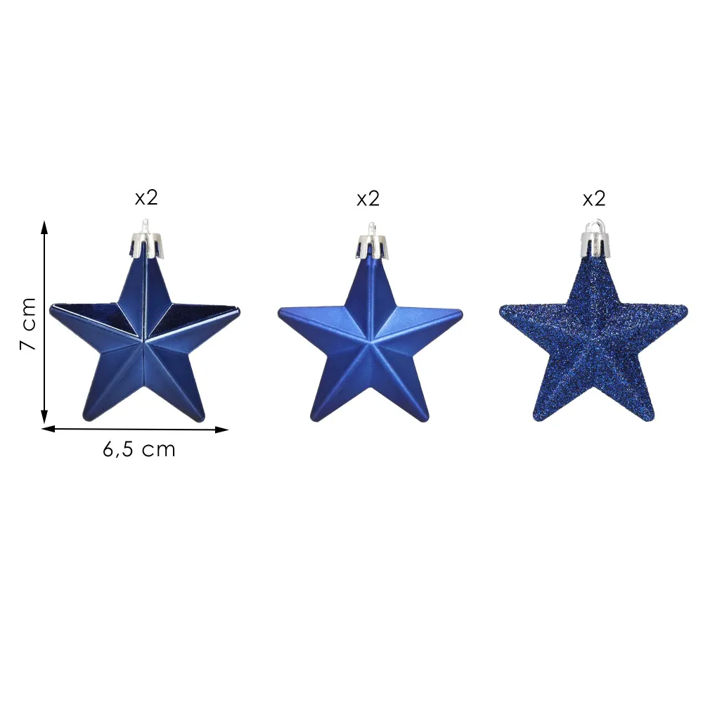 Sada 6 ks modrých ozdôb na stromček s motívom hviezdy. Výška ozdoby 7 cm, s tromi rôznymi vzormi, pútko na zavesenie, nerozbitný plastový materiál.