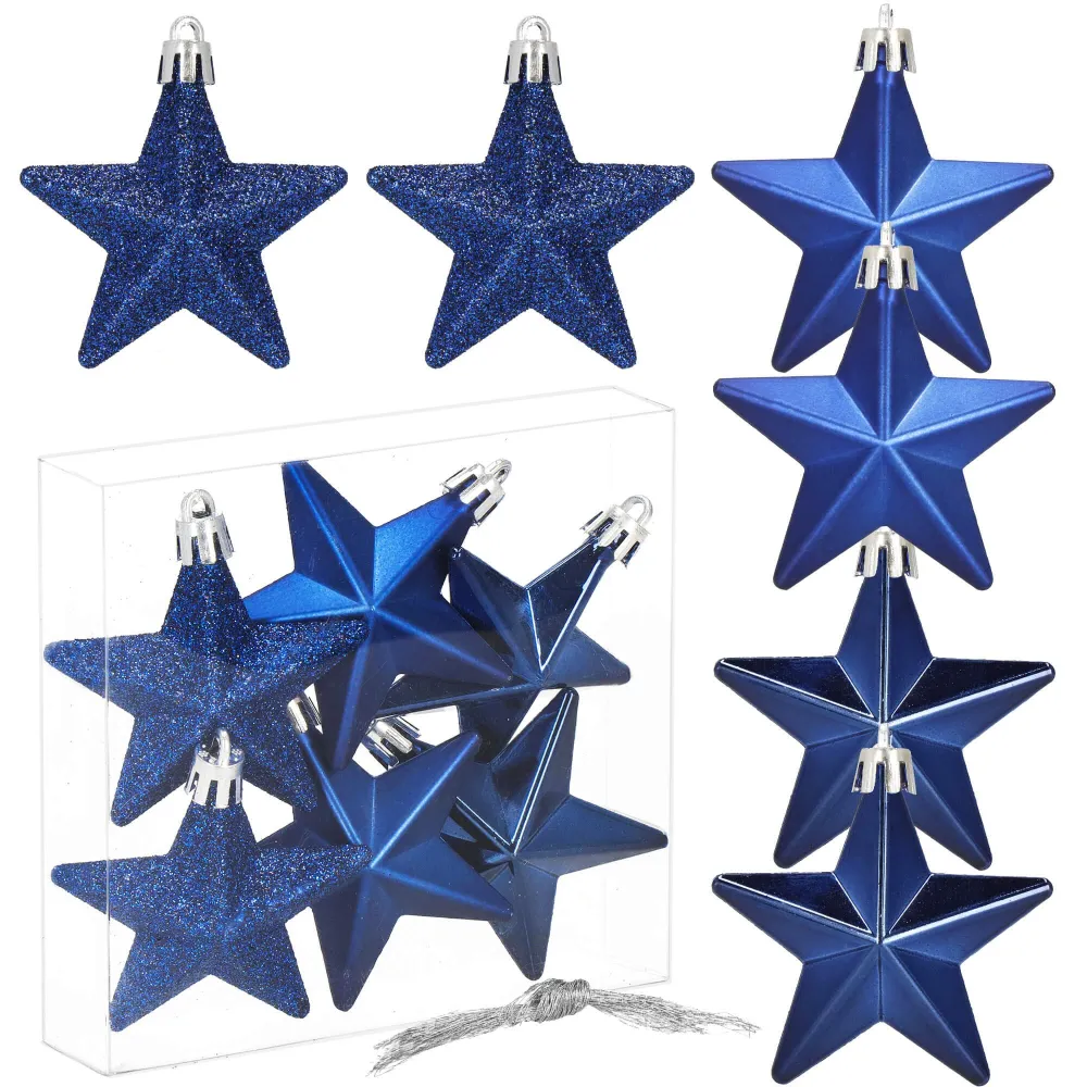 Sada 6 ks modrých ozdôb na stromček s motívom hviezdy. Výška ozdoby 7 cm, s tromi rôznymi vzormi, pútko na zavesenie, nerozbitný plastový materiál. Ideálne na výzdobu stromčeka alebo ako vianočné dekorácie. Zadarmo povrázky pre ľahké zavesenie.