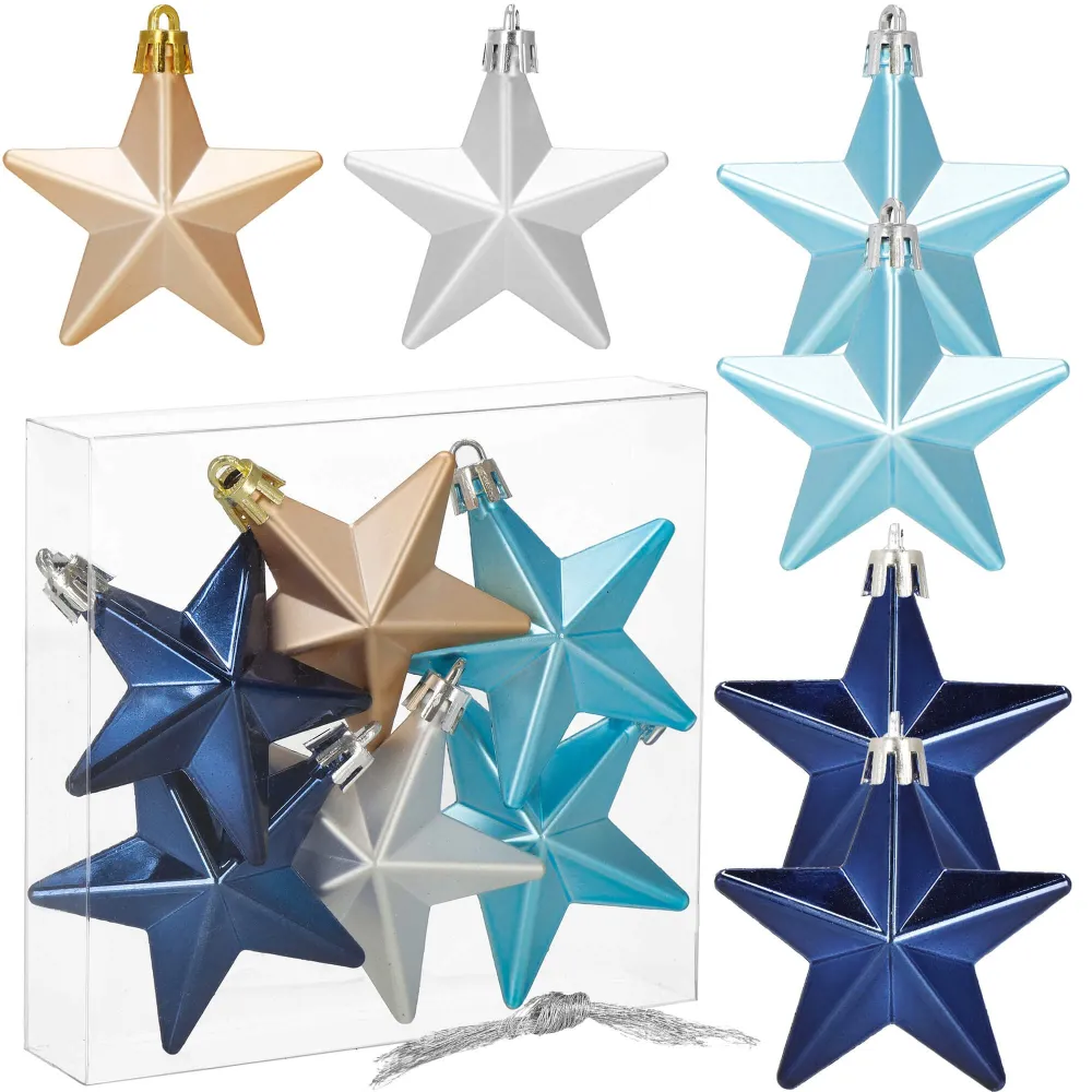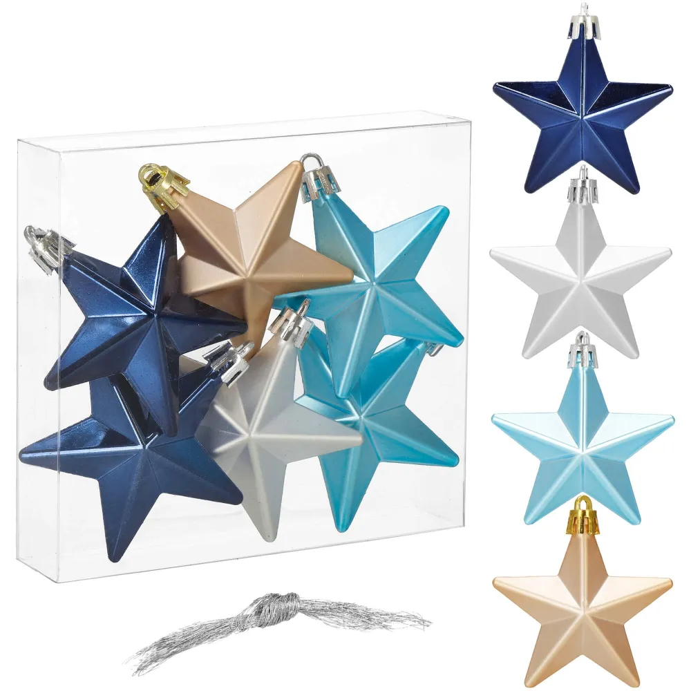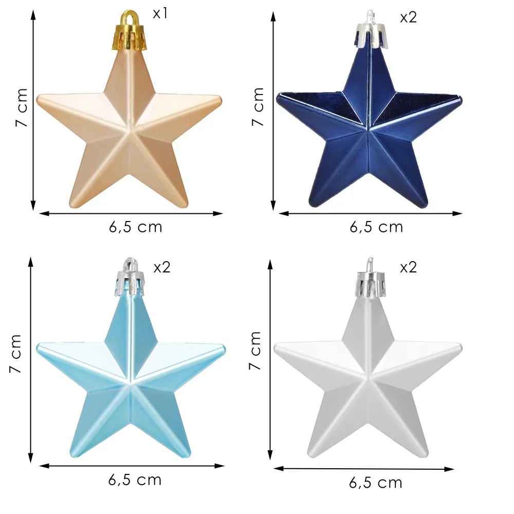 Súprava 6 ks modro-strieborných ozdôb na stromček s motívom hviezdy. Výška ozdoby 7 cm, lesklé a matné prevedenie, pútko na zavesenie, nerozbitný plastový materiál. Ideálne na výzdobu stromčeka alebo ako vianočné dekorácie. Zadarmo povrázky pre ľahké zavesenie.