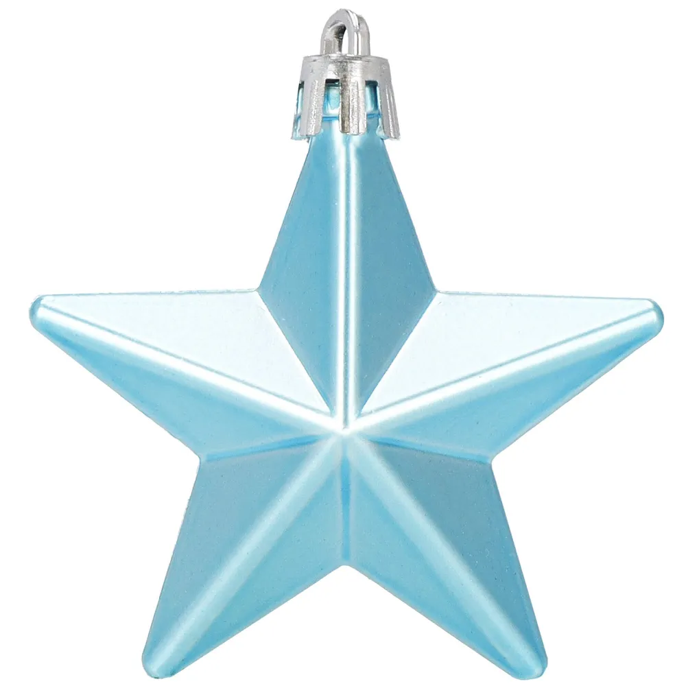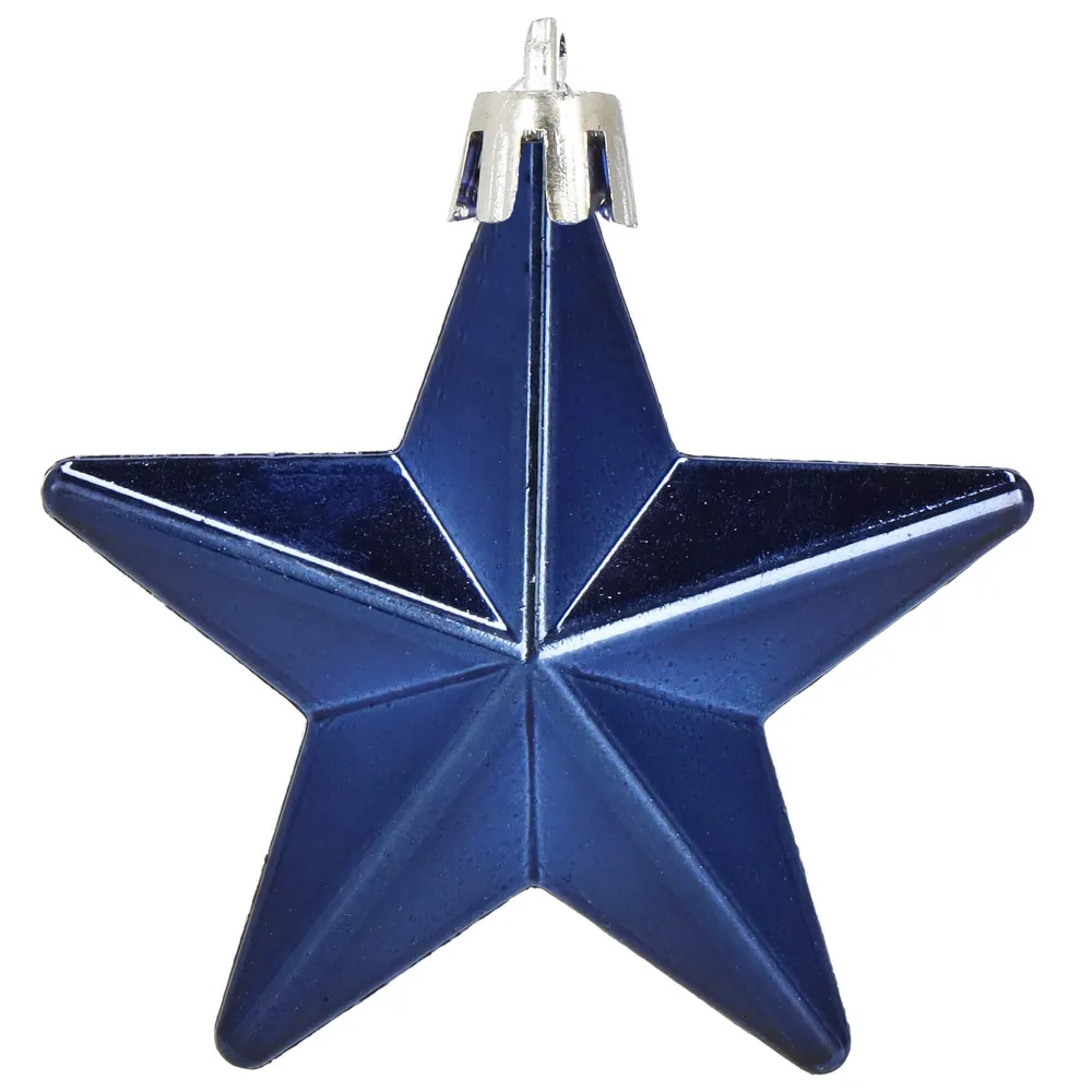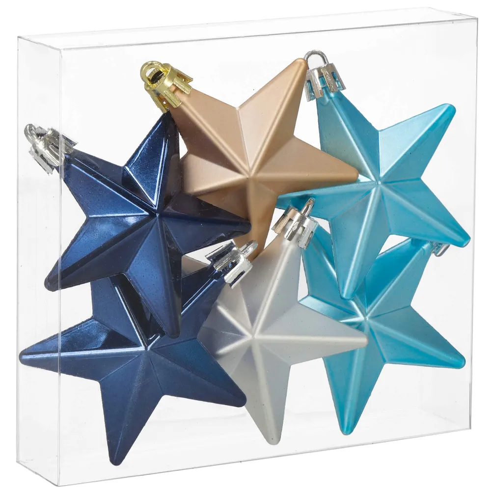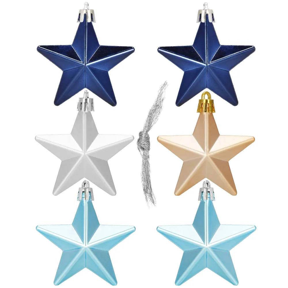 Súprava 6 ks modro-strieborných ozdôb na stromček s motívom hviezdy. Výška ozdoby 7 cm, lesklé a matné prevedenie, pútko na zavesenie, nerozbitný plastový materiál. Ideálne na výzdobu stromčeka alebo ako vianočné dekorácie. Zadarmo povrázky pre ľahké zavesenie.