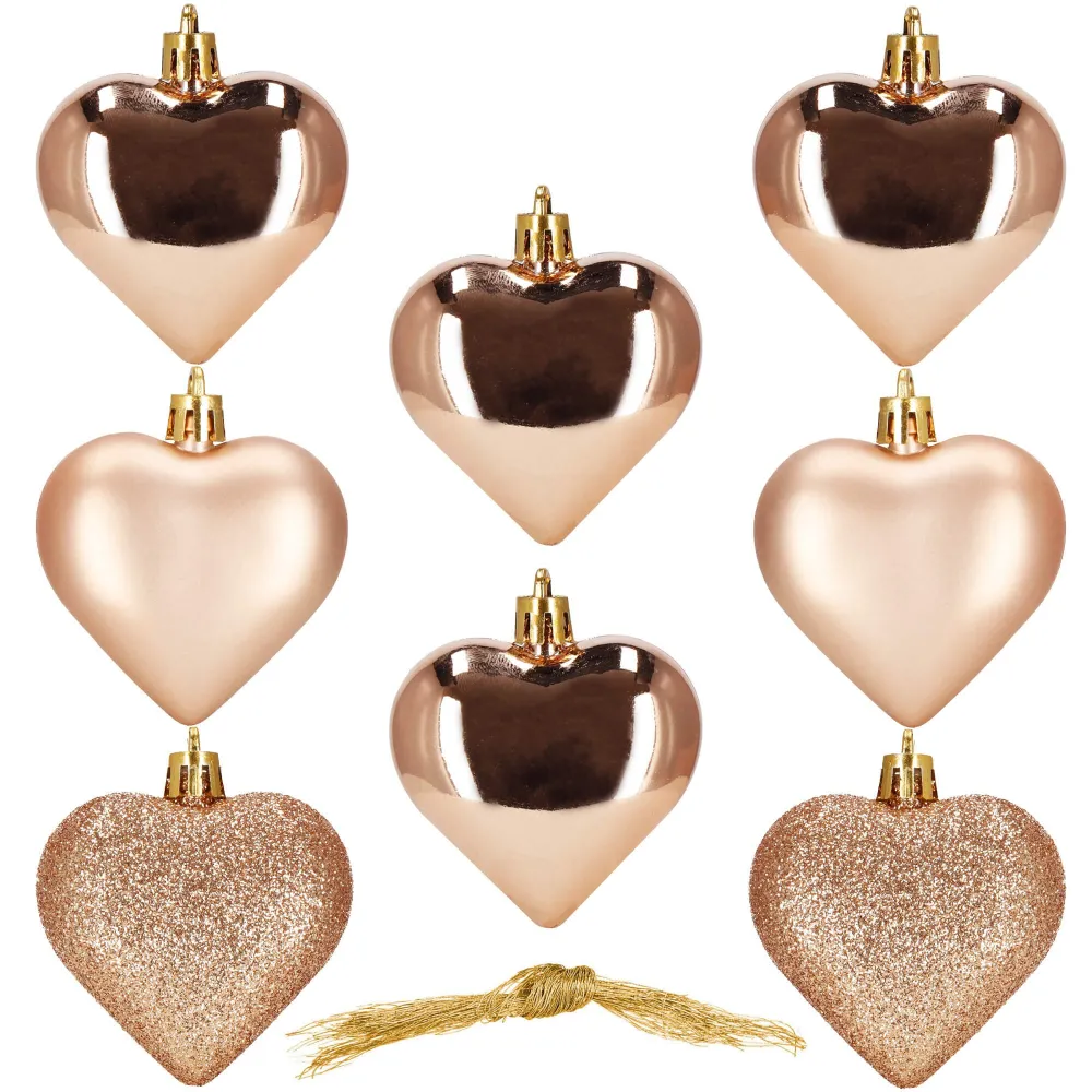 Sada 8 ks ružových ozdôb na stromček s motívom srdca. Výška ozdoby 7 cm, s tromi vzormi, pútko na zavesenie, nerozbitný plastový materiál. Ideálne na výzdobu stromčeka alebo ako vianočné dekorácie. Zadarmo povrázky pre ľahké zavesenie.