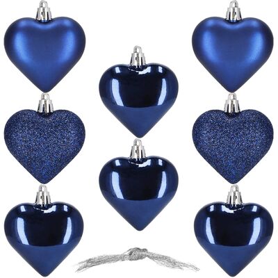 Sada 8 ks modrých ozdôb na stromček s motívom srdca. Výška ozdoby 7 cm, s tromi vzormi, pútko na zavesenie, nerozbitný plastový materiál. Ideálne na výzdobu stromčeka alebo ako vianočné dekorácie. Zadarmo povrázky pre ľahké zavesenie.