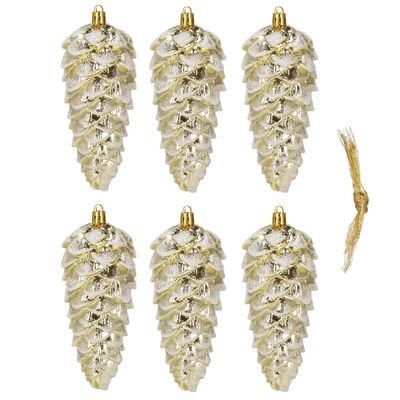 Sada 6 ks zlatých ozdôb na stromček s motívom šišky. Výška ozdoby 14 cm, lesklé s bielymi trblietkami, ktoré vytvárajú efekt námrazy, pútko na zavesenie, nerozbitný plastový materiál. Ideálne na výzdobu stromčeka alebo ako vianočné dekorácie. Zadarmo povrázky pre ľahké zavesenie.