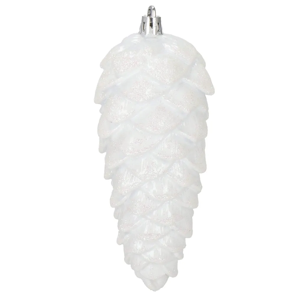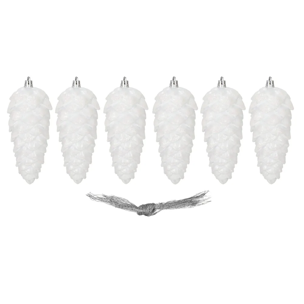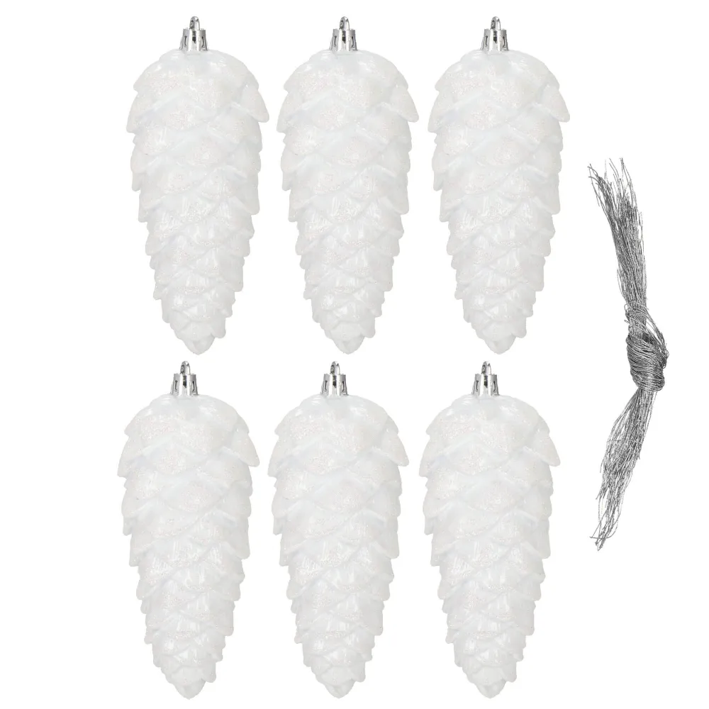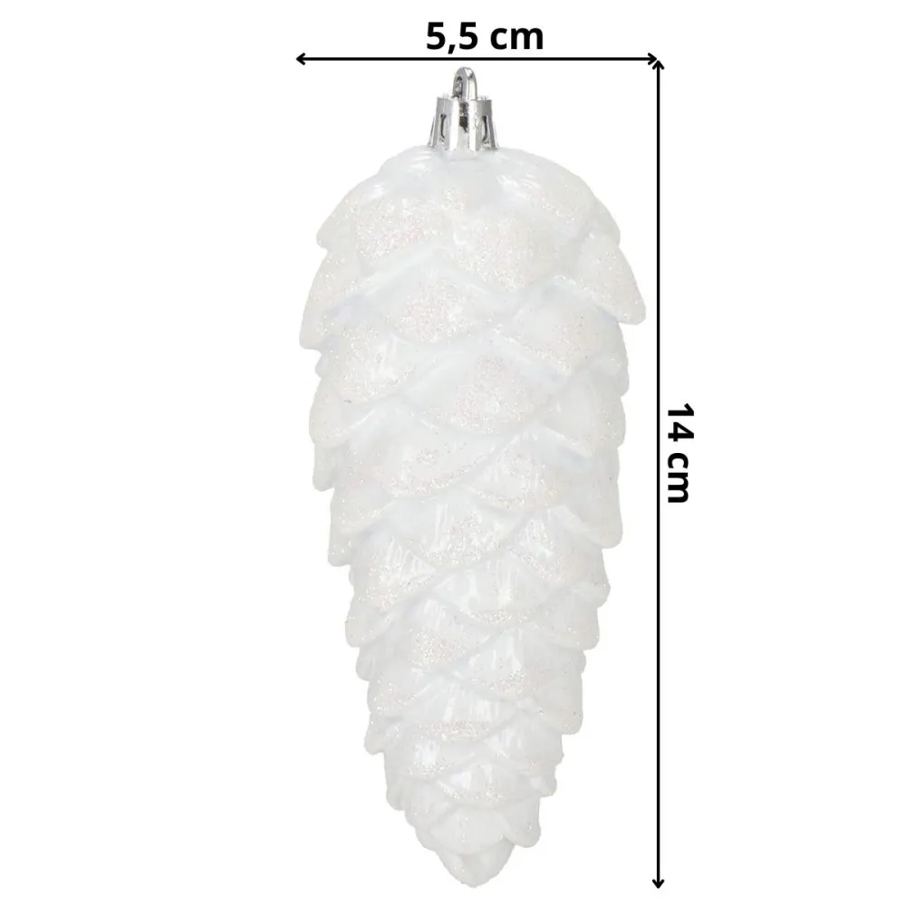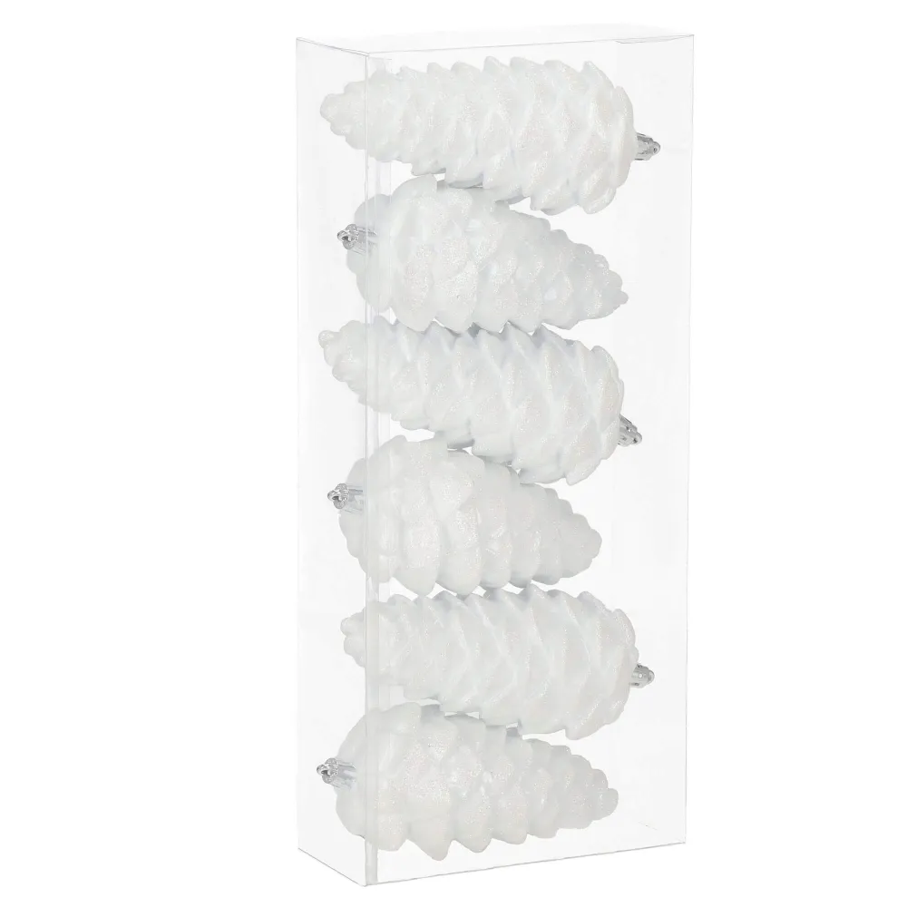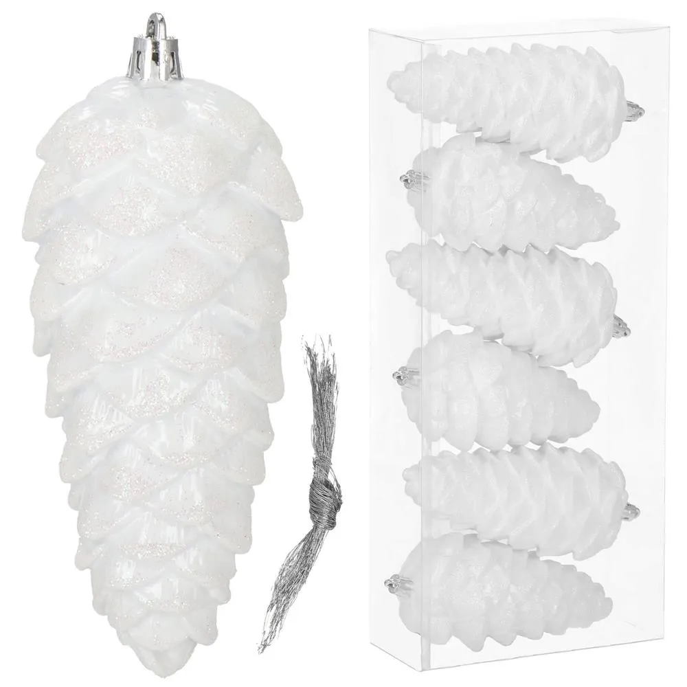 Sada 6 ks bielych ozdôb na stromček s motívom šišky. Výška ozdoby 14 cm, lesklé prevedenie s trblietkami, pútko na zavesenie, nerozbitný plastový materiál. Ideálne na výzdobu stromčeka alebo ako vianočné dekorácie. Zadarmo povrázky pre ľahké zavesenie.