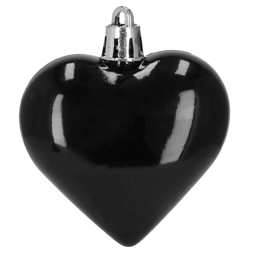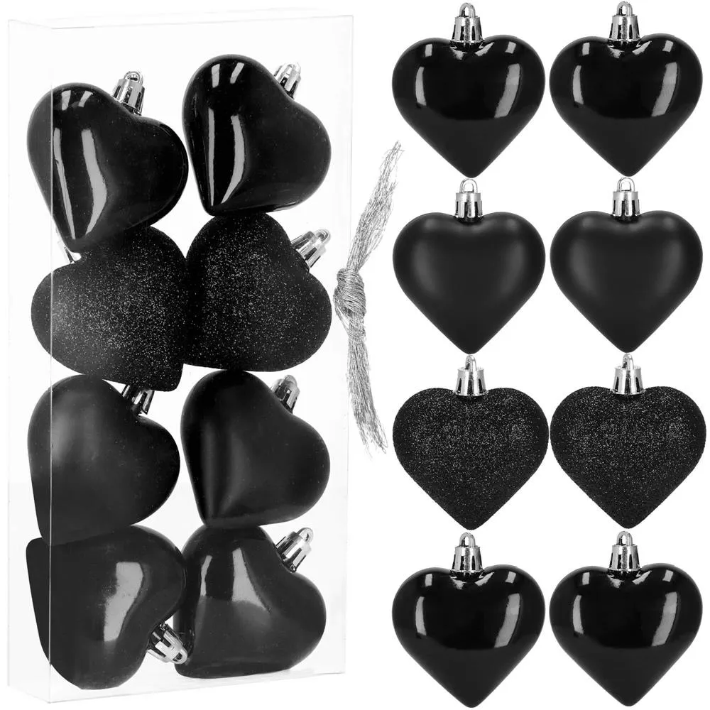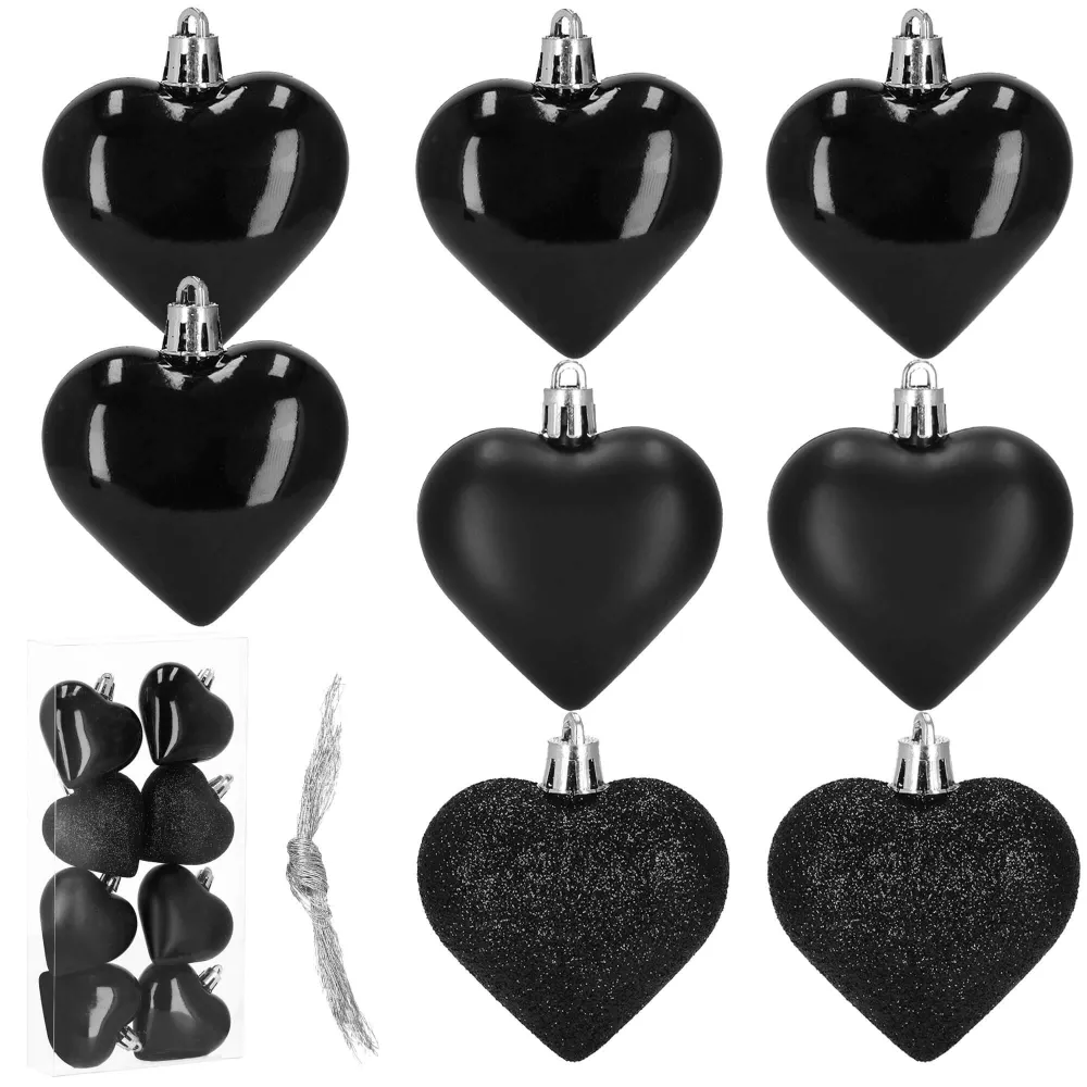Sada 8 ks čiernych ozdôb na stromček s motívom srdca. Výška ozdoby 7 cm, s tromi vzormi, pútko na zavesenie, nerozbitný plastový materiál. Ideálne na výzdobu stromčeka alebo ako vianočné dekorácie. Zadarmo povrázky pre ľahké zavesenie.