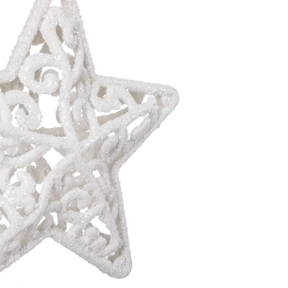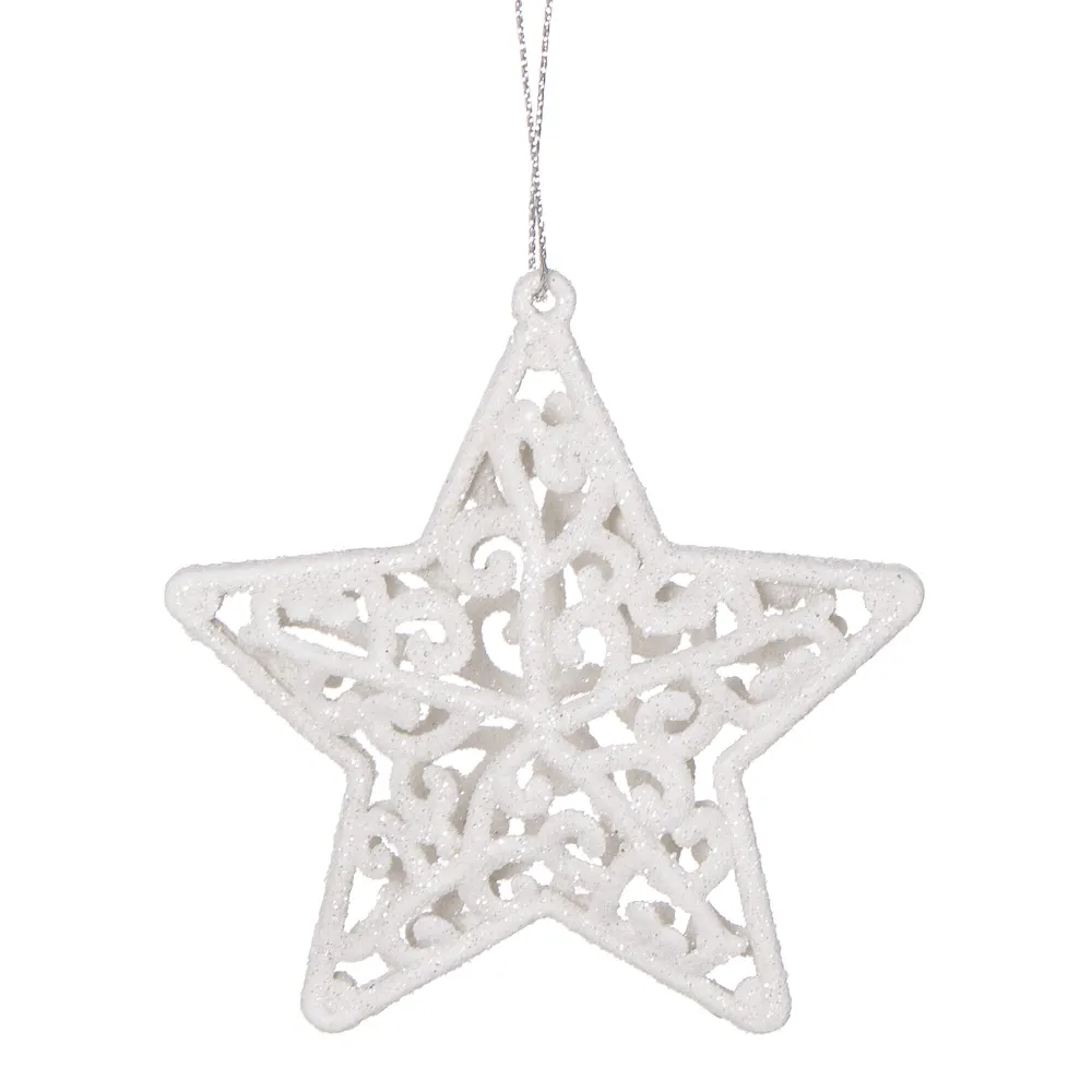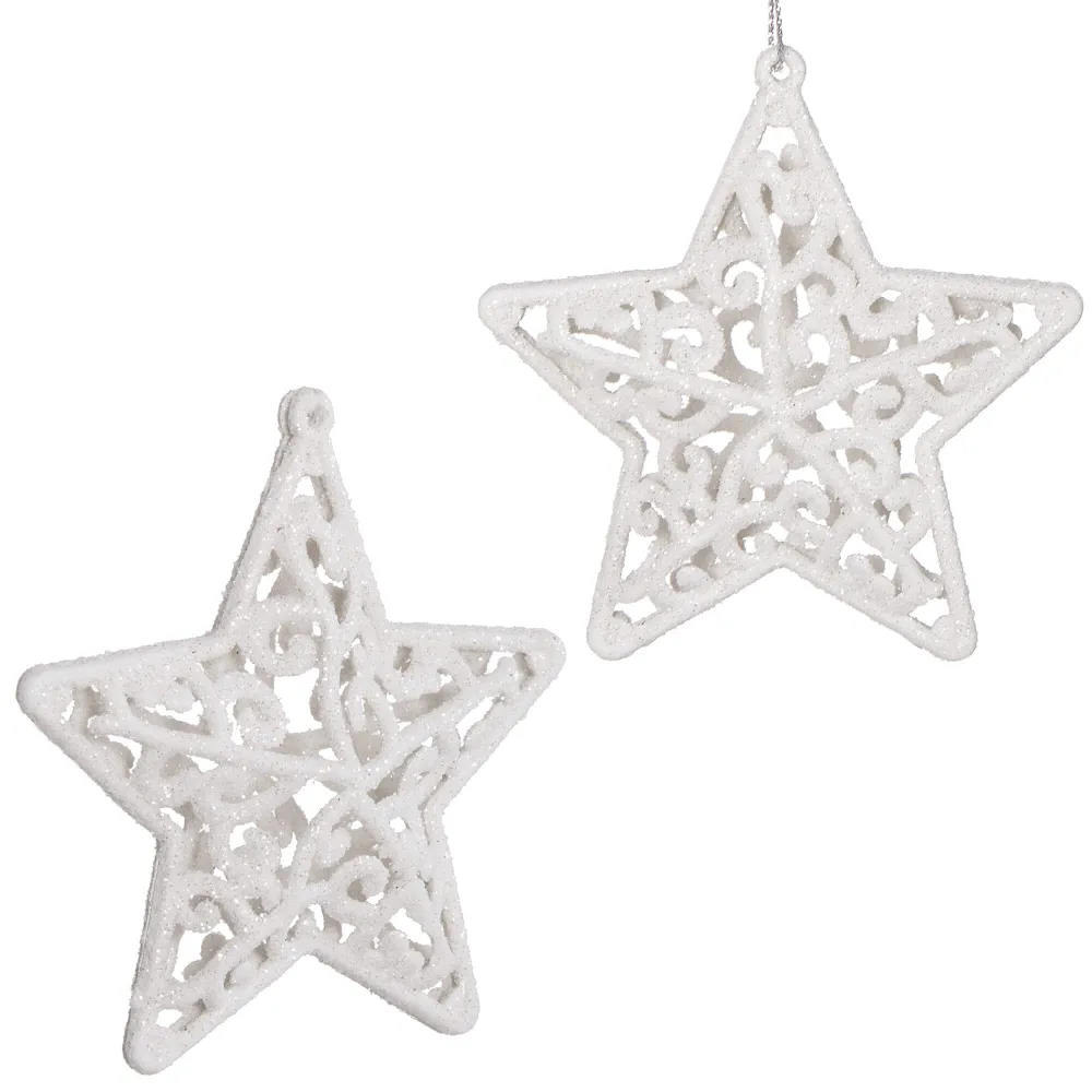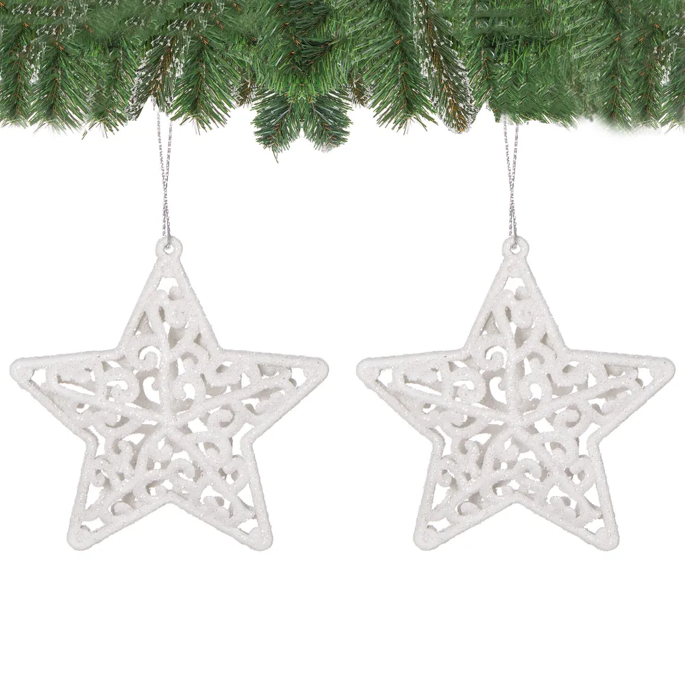 Súprava dvoch kusov bielych hviezd zdobených trblietkami a špagátom na zavesenie . Výška 8 cm, nerozbitný, plastový materiál. Ideálne na výzdobu stromčekov alebo ako vianočné dekorácie.