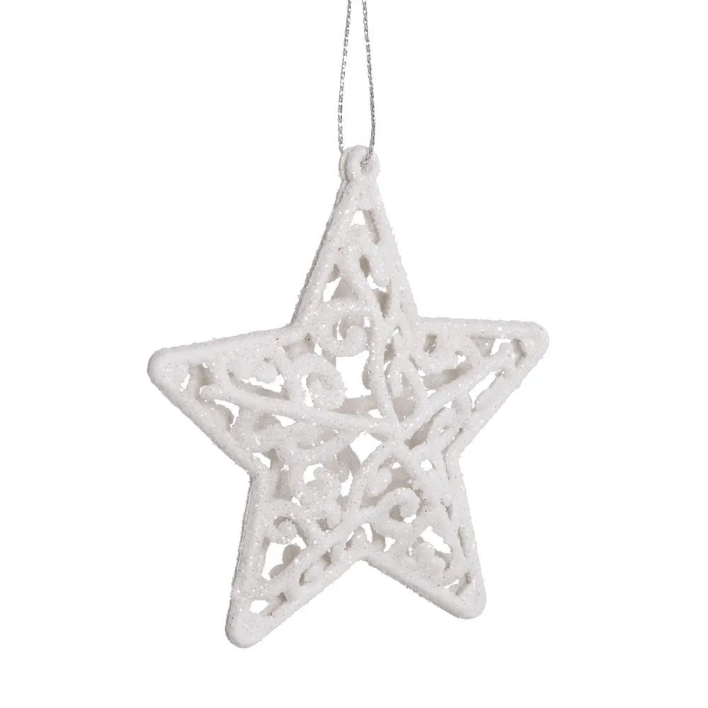 Súprava dvoch kusov bielych hviezd zdobených trblietkami a špagátom na zavesenie. Výška 8 cm, nerozbitný, plastový materiál. Ideálne na výzdobu stromčekov alebo ako vianočné dekorácie.