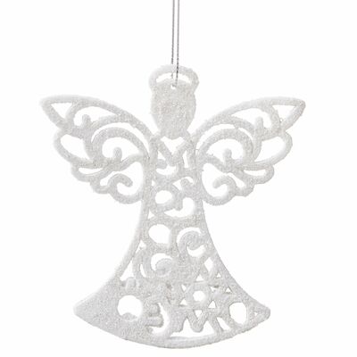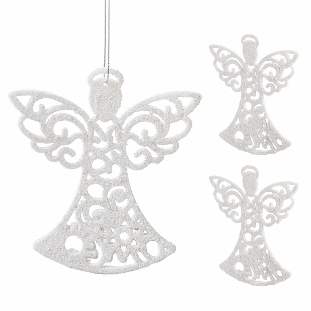 Sada troch kusov vianočných ozdôb v tvare anjelov zdobených trblietkami a špagátom na zavesenie. Výška 10 cm, nerozbitný, plastový materiál. Ideálne na výzdobu stromčekov alebo ako vianočné dekorácie.