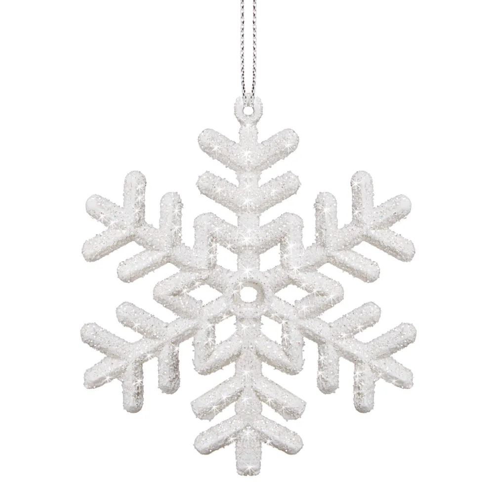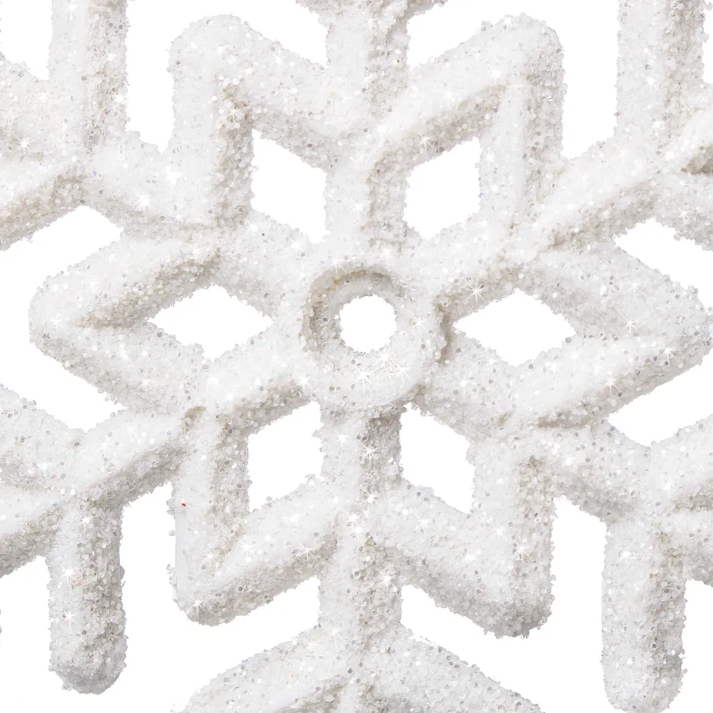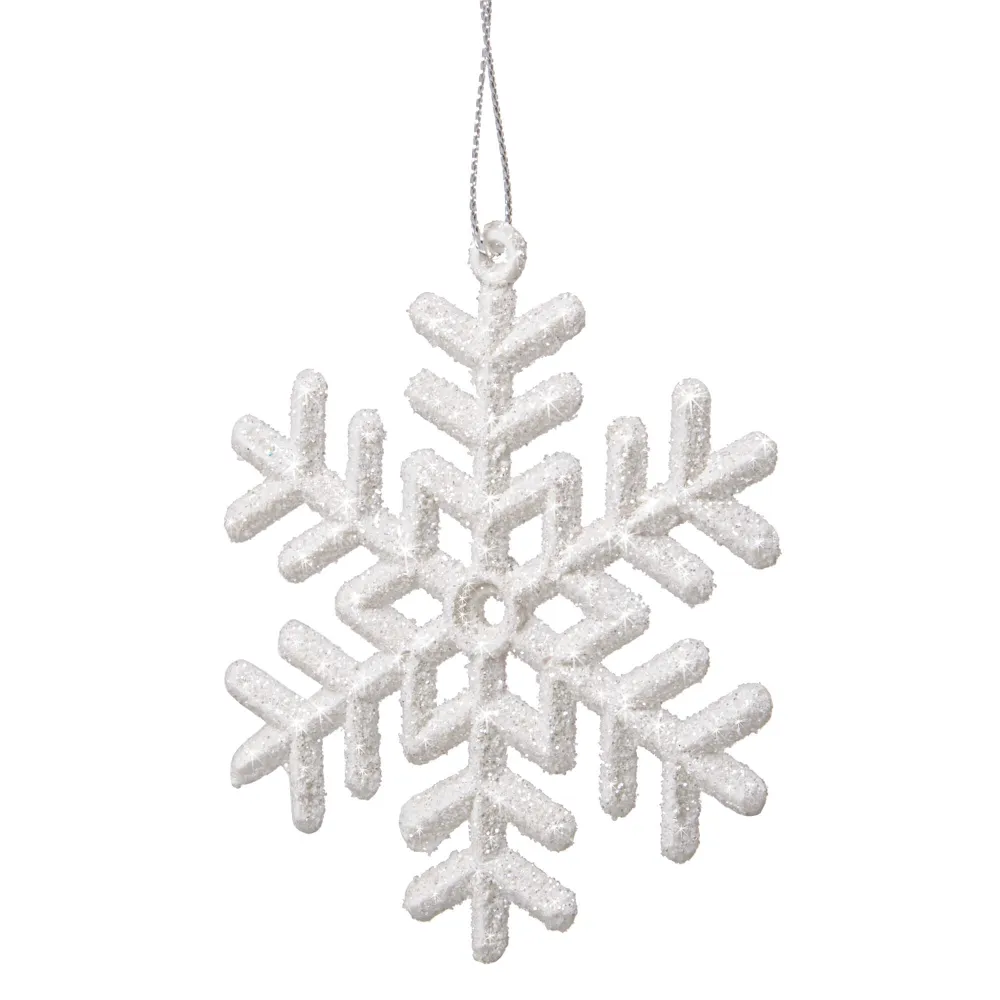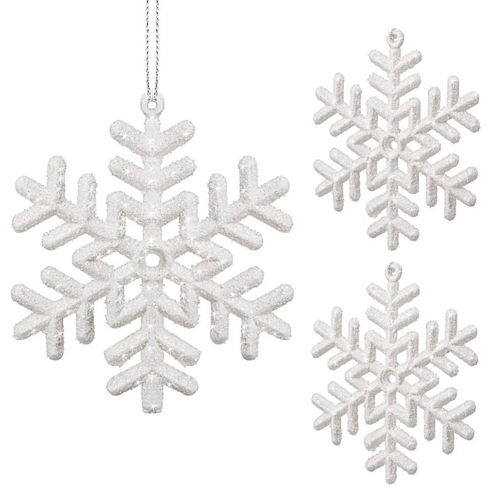 Súprava troch kusov bielych vločiek zdobených trblietkami a špagátom na zavesenie. Výška 10 cm, nerozbitný, plastový materiál. Ideálne na výzdobu stromčekov alebo ako vianočné dekorácie.