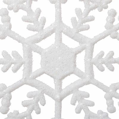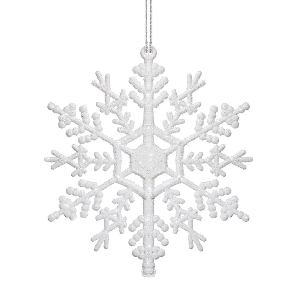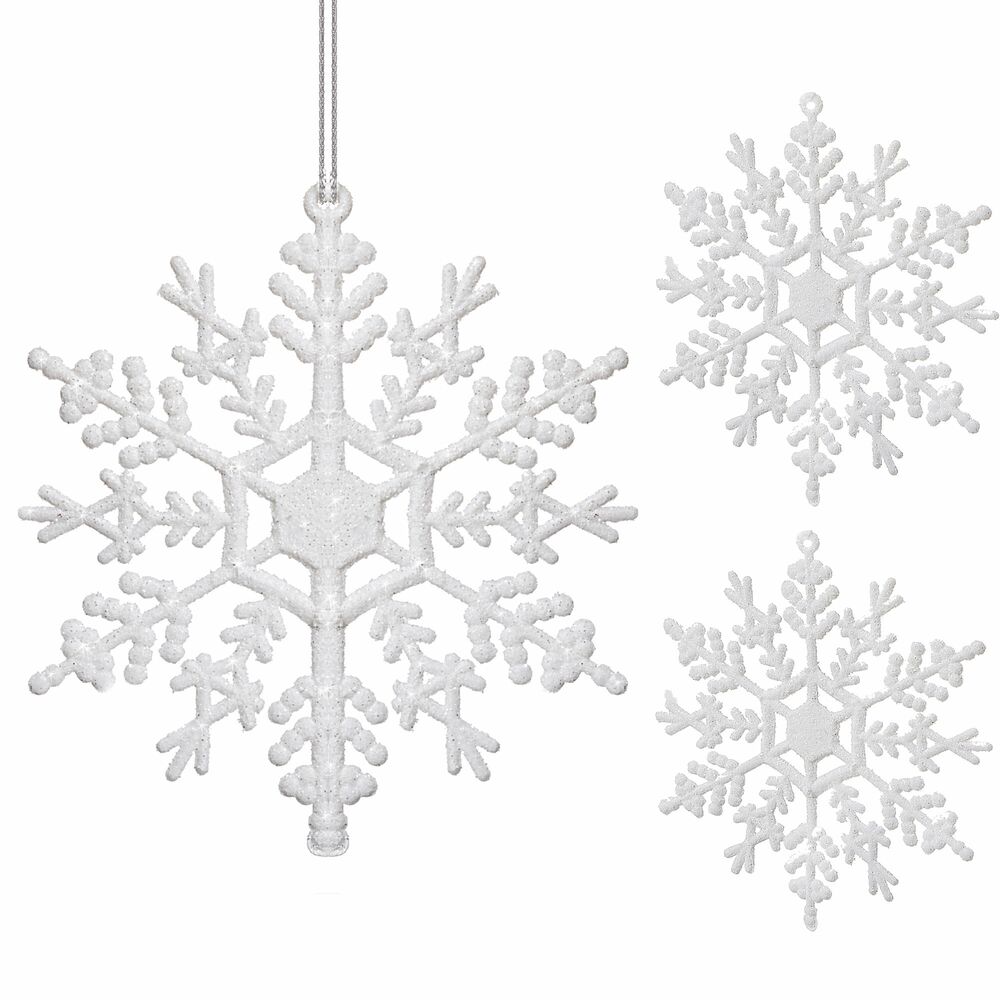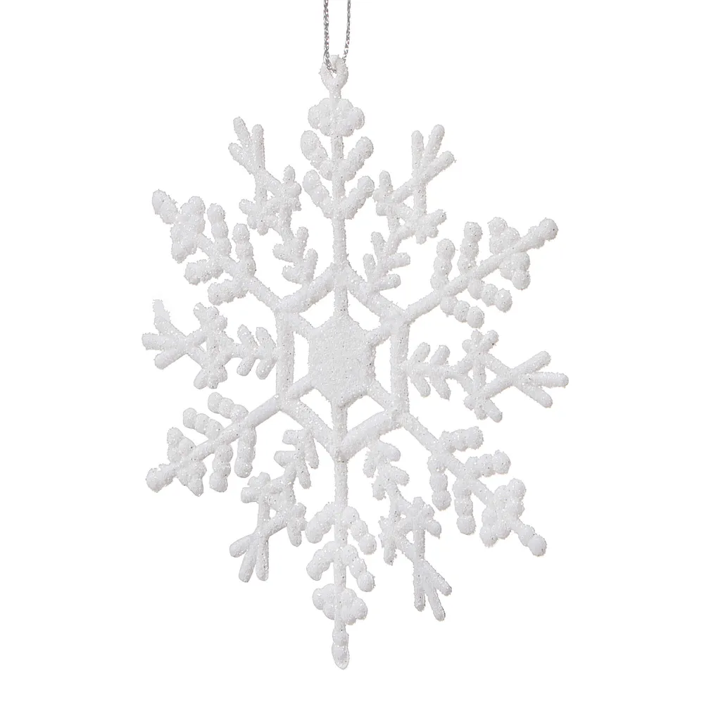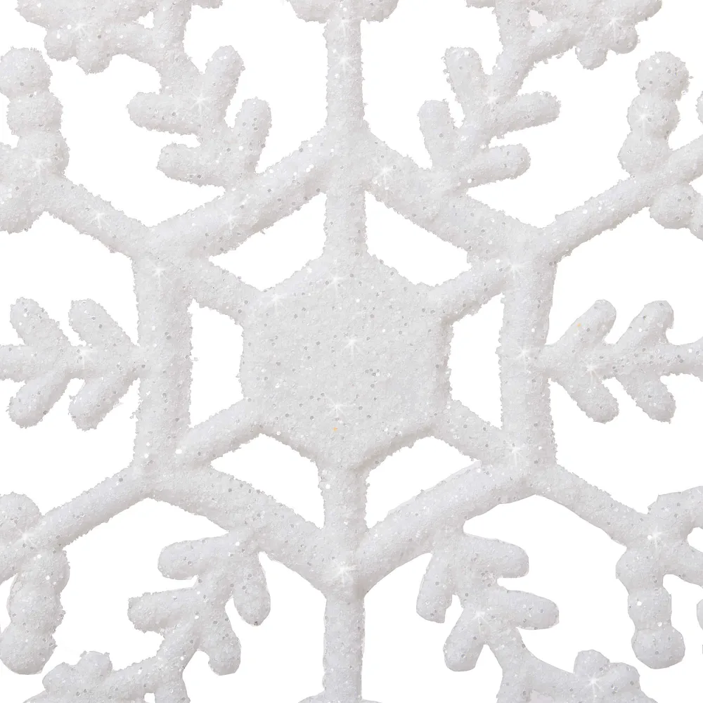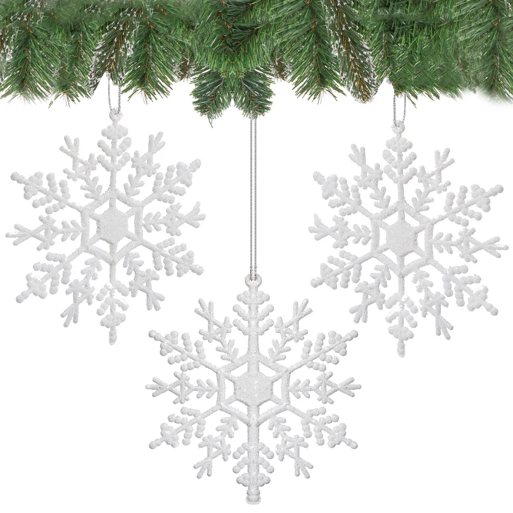 Súprava troch kusov bielych vločiek zdobených trblietkami a špagátom na zavesenie. Výška 12 cm, nerozbitný, plastový materiál. Ideálne na výzdobu stromčekov alebo ako vianočné dekorácie.