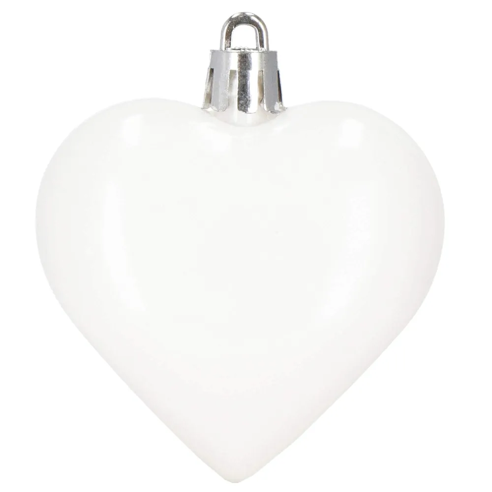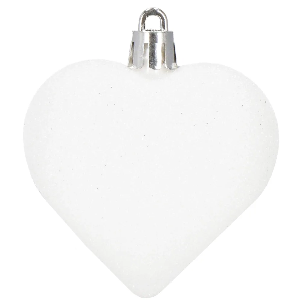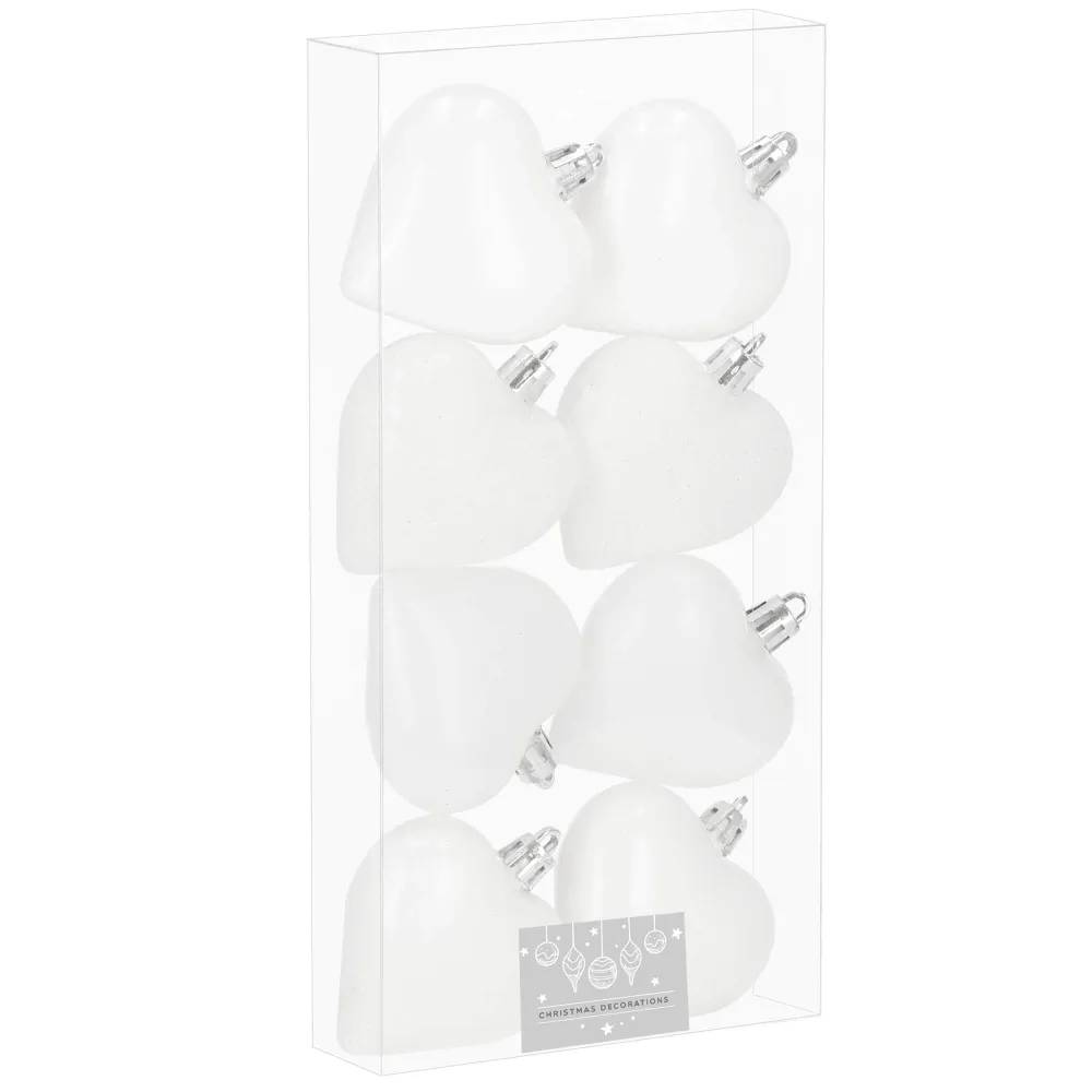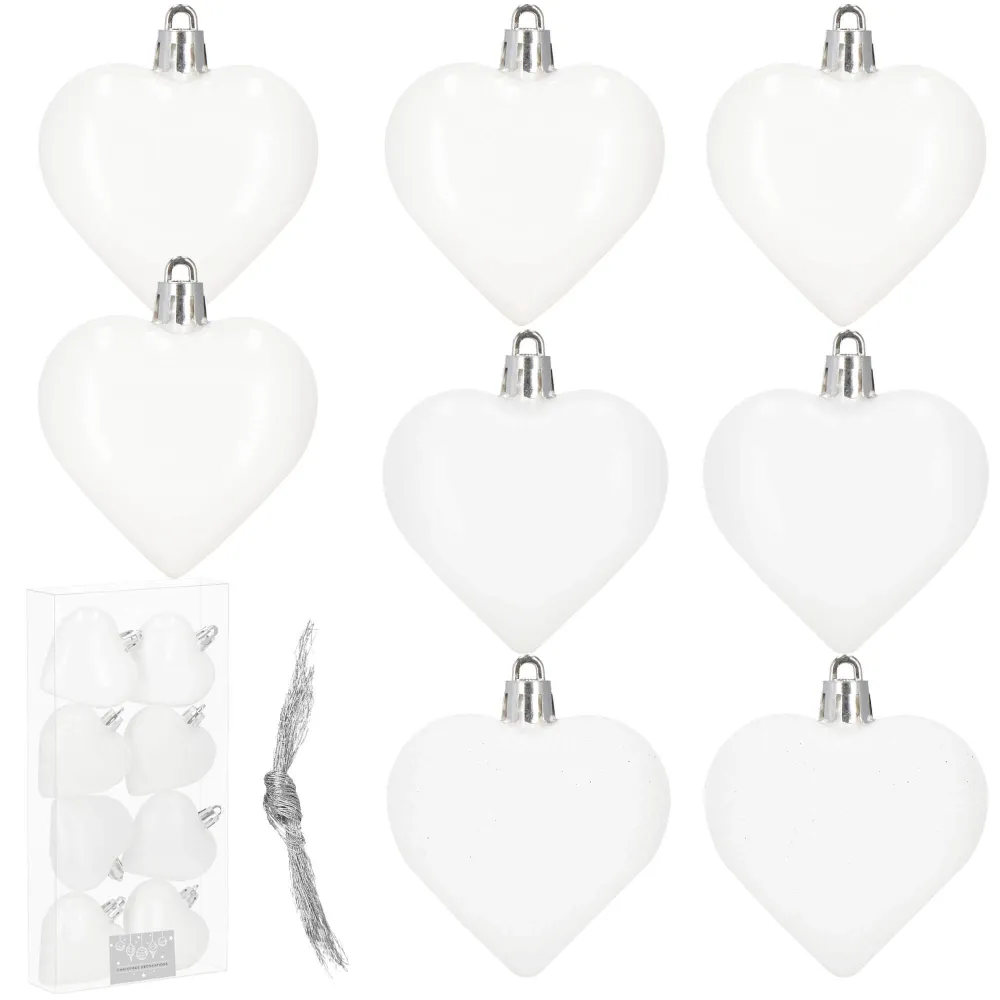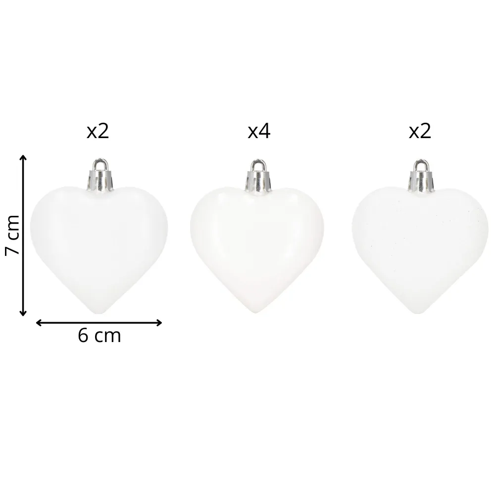 Sada vianočných ozdôb v tvare srdiečok v bielom prevedení dodá vašej výzdobe jemný a romantický vzhľad. Ideálna ako dekorácia na vianočný stromček, sviatočný stôl alebo do okien. Vyrobené z nerozbitného plastového materiálu, vhodné na vnútorné i vonkajšie použitie. Súčasťou balenia sú pútka na zavesenie. Priemer 6 cm, celkom 8 kusov v sade.