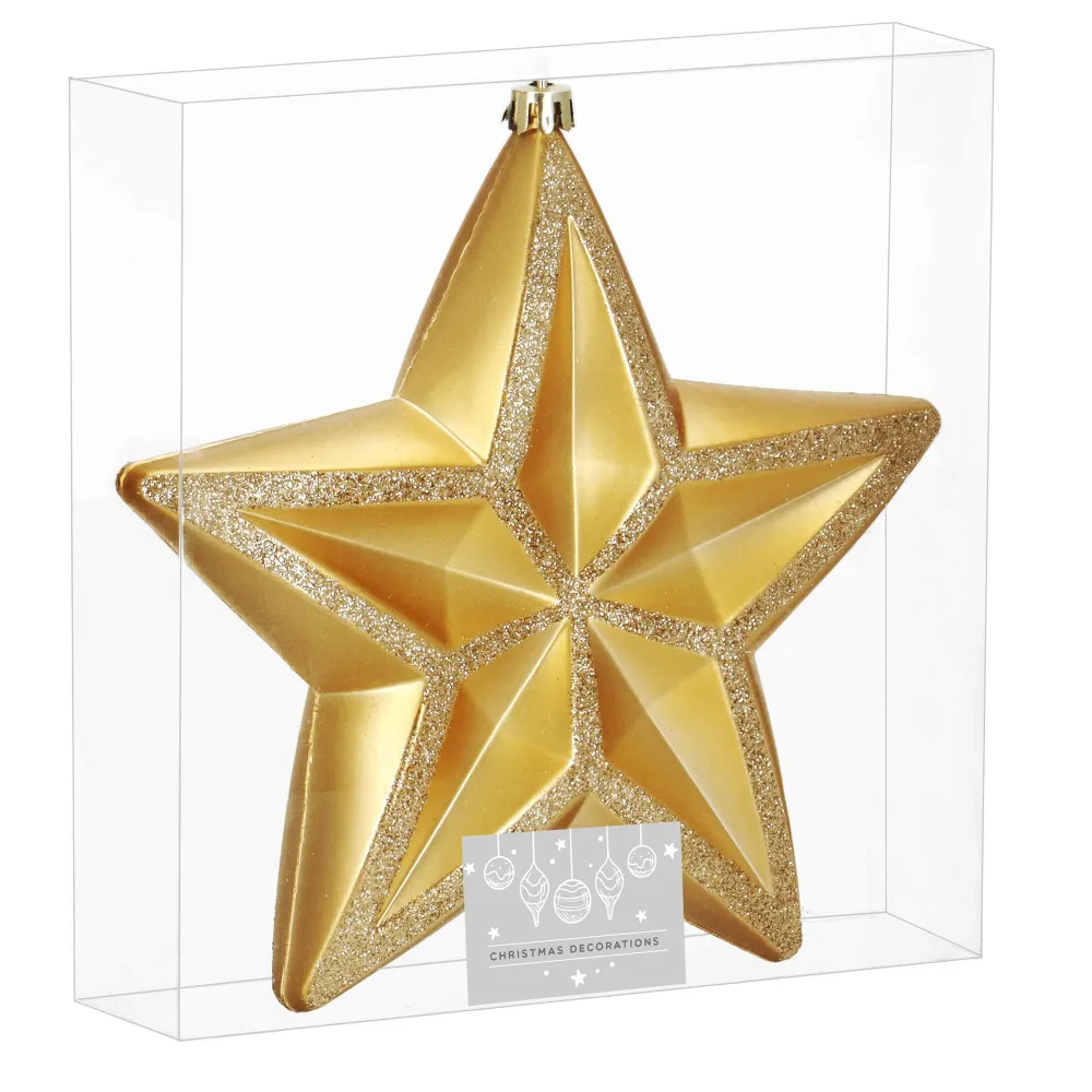 Vianočná hviezda zlatá 16×15 cm je elegantná ozdoba, ktorá dodá vianočnej výzdobe luxusný a slávnostný nádych. Kombinácia matného a lesklého povrchu vytvára výrazný 3D efekt, vďaka ktorému hviezda krásne vynikne na stromčeku aj v ďalších dekoráciách. Ozdoba je vyrobená z nerozbitného plastu , takže je ľahká, bezpečná a vhodná do každej domácnosti.