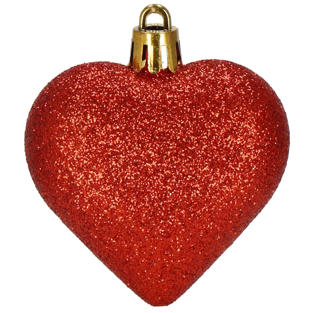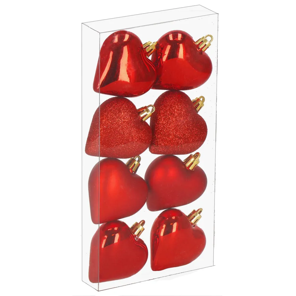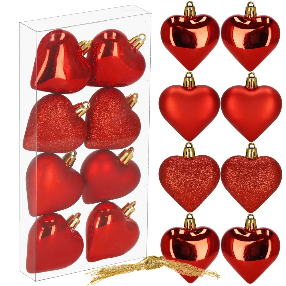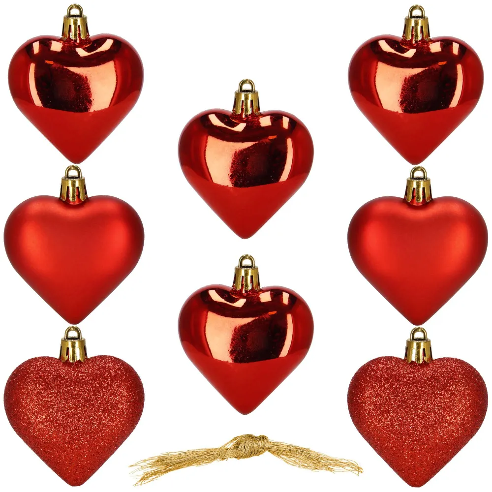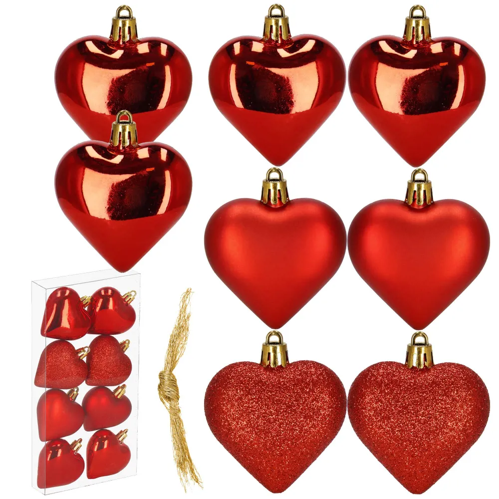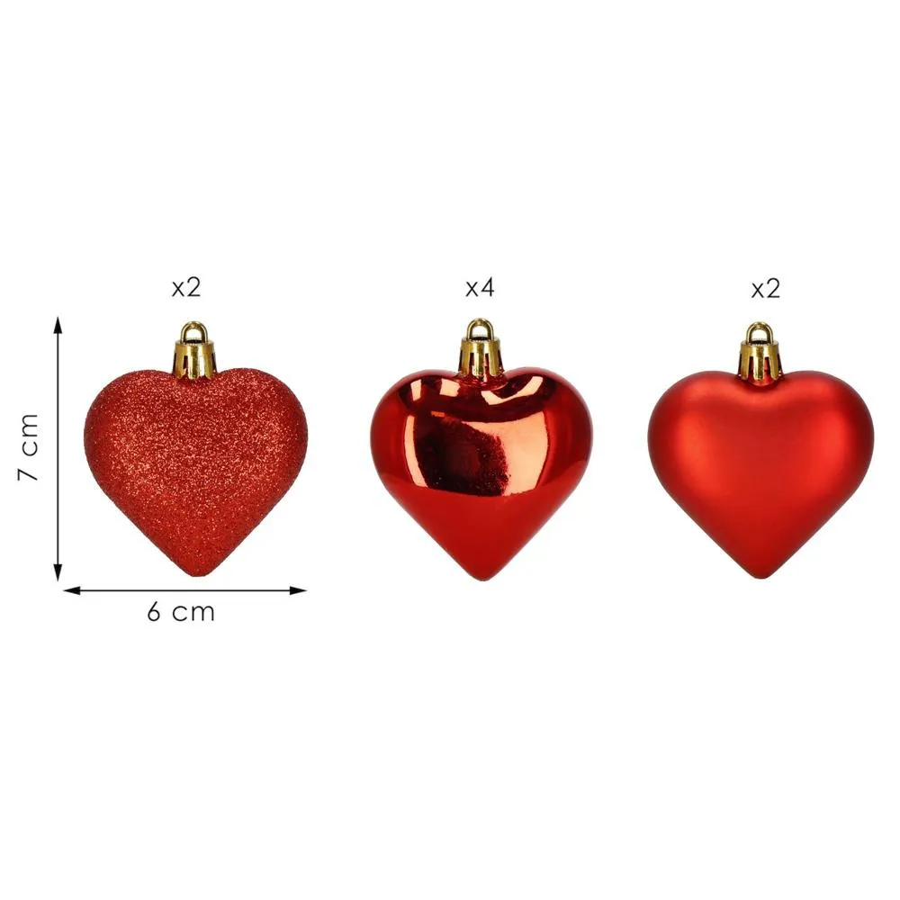 Sada vianočných ozdôb v tvare srdiečok v červenom prevedení dodá vašej výzdobe hrejivý a slávnostný vzhľad. Ideálna ako dekorácia na vianočný stromček, sviatočný stôl alebo do okien. Vyrobené z nerozbitného plastového materiálu, vhodné na vnútorné aj vonkajšie použitie. Súčasťou balenia sú pútka na zavesenie. Priemer 6 cm, celkom 8 kusov v sade.