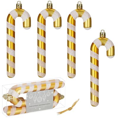 Lesklé a trblietavé vianočné ozdoby v tvare zlatých cukrových paličiek dodajú stromčeku elegantný a moderný vzhľad. Sú vyrobené z nerozbitného plastu, takže sú ľahké a bezpečné. Vďaka pútku a priloženému povrázku ich ľahko zavesíte kamkoľvek. Rozmery 14 × 1,5/4,5 cm z nich robia výrazný, ale stále jemný dekoratívny prvok.