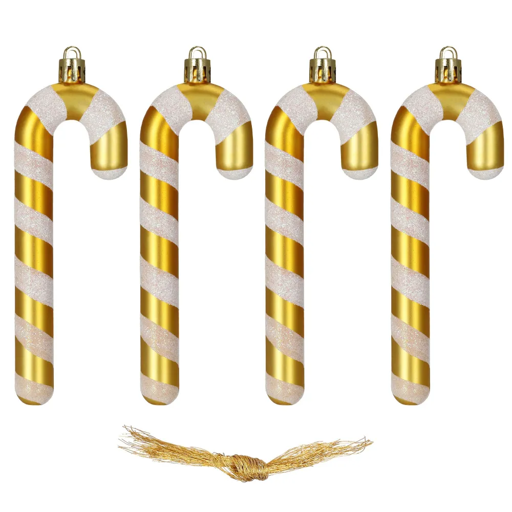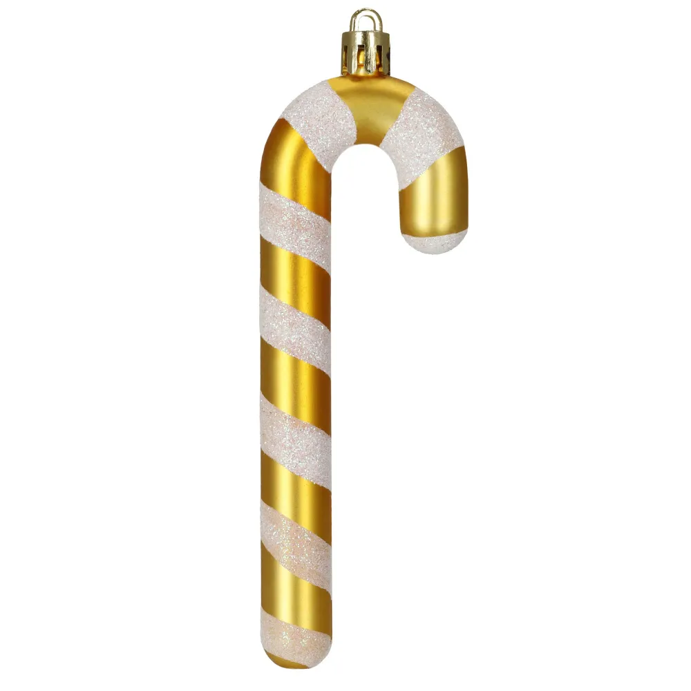 Lesklé a trblietavé vianočné ozdoby v tvare zlatých cukrových paličiek dodajú stromčeku elegantný a moderný vzhľad. Sú vyrobené z nerozbitného plastu, takže sú ľahké a bezpečné. Vďaka pútku a priloženému povrázku ich ľahko zavesíte kamkoľvek. Rozmery 14 × 1,5/4,5 cm z nich robia výrazný, ale stále jemný dekoratívny prvok.