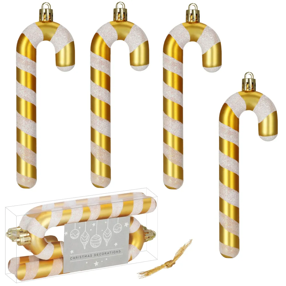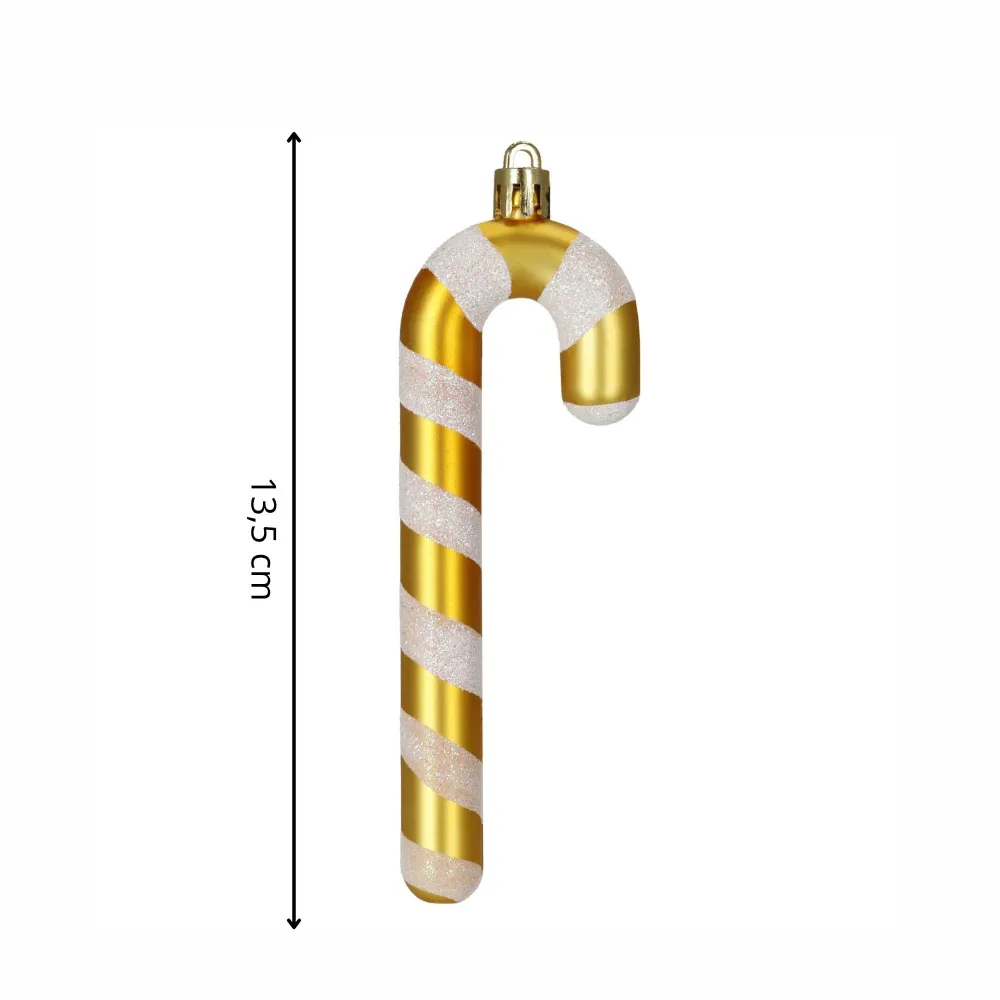 Cukrová palička zlatá 14 cm sada 4 ks je elegantná vianočná ozdoba, ktorá dodá stromčeku moderný a slávnostný vzhľad. Vďaka lesklému a trblietavému prevedeniu krásne odráža svetlo a pôsobí veľmi dekoratívne. Ozdoby sú vyrobené z nerozbitného plastu , takže sú ľahké, odolné a bezpečné aj v domácnostiach s deťmi alebo domácimi miláčikmi.