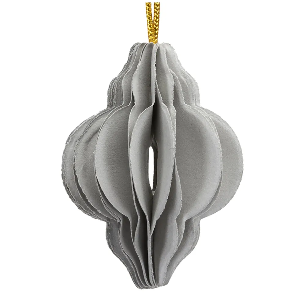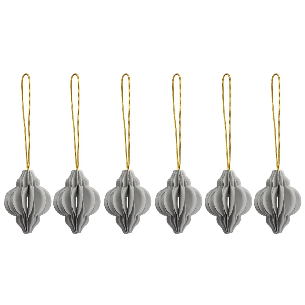 Sada šiestich jemných papierových ozdôb v šedom tóne dodá výzdobe nežný a moderný nádych. Vďaka pútkam ich ľahko zavesíte na stromček aj do ďalších aranžmánov, kde krásne vyniknú svojim drobným tvarom. Ľahký papierový materiál je ideálny na vnútorné použitie a pôsobí vzdušne a elegantne. Skvelé na doplnenie škandinávskeho či minimalistického štýlu a vytvorenie útulnej zimnej atmosféry.