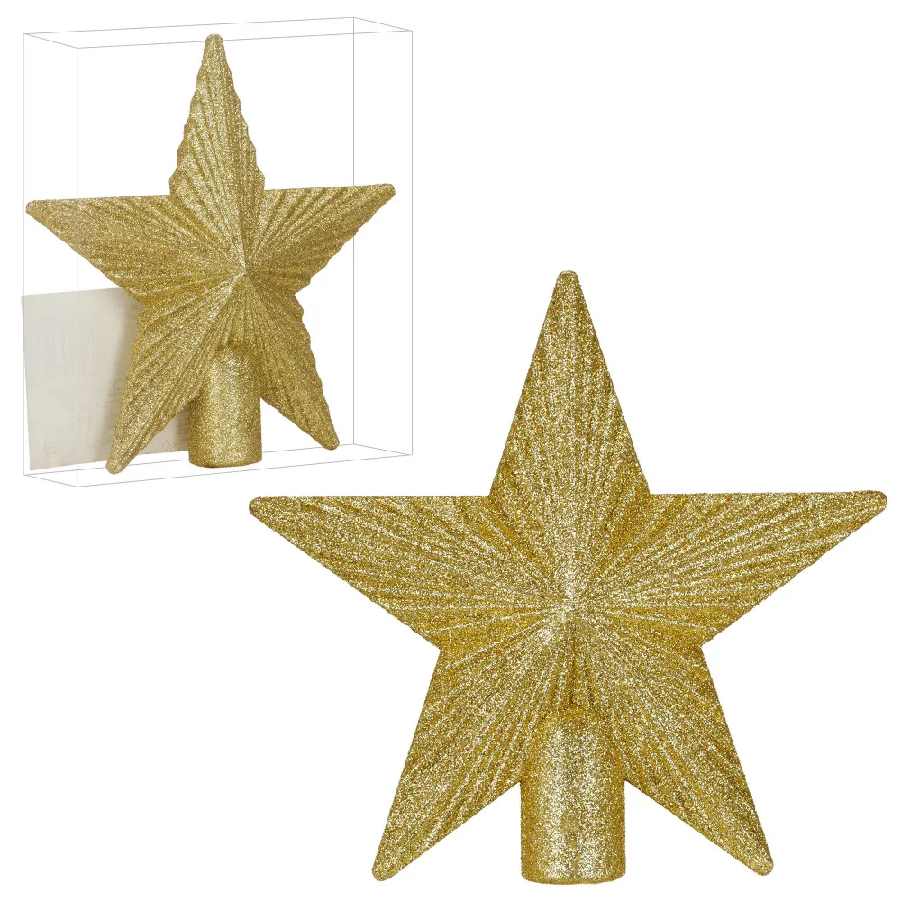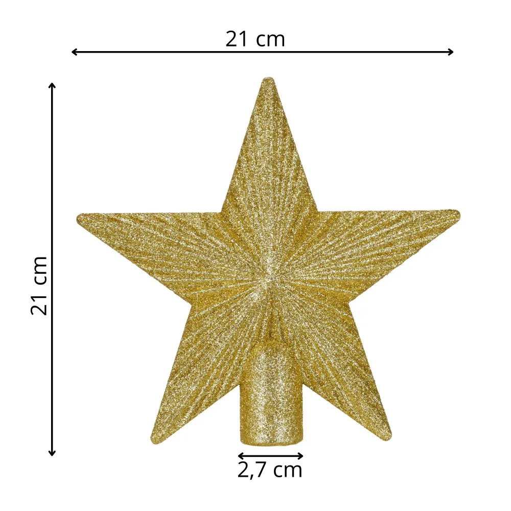Hviezda na vianočný stromček 21 cm zlatá je výrazná a elegantná dekorácia, ktorá dodá vianočnému stromčeku luxusnú a slávnostnú atmosféru. Jej bohatý zlatý lesk krásne odráža svetlo a vytvára efekt skutočnej vianočnej iskry. Vďaka ľahkej konštrukcii z nerozbitného plastového materiálu sa hviezda ľahko nasadzuje a je bezpečná aj pre domácnosti s deťmi či miláčikmi. Tradičný tvar hviezdy podčiarkuje symboliku Vianoc a výborne ladí s modernými aj klasickými ozdobami.