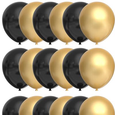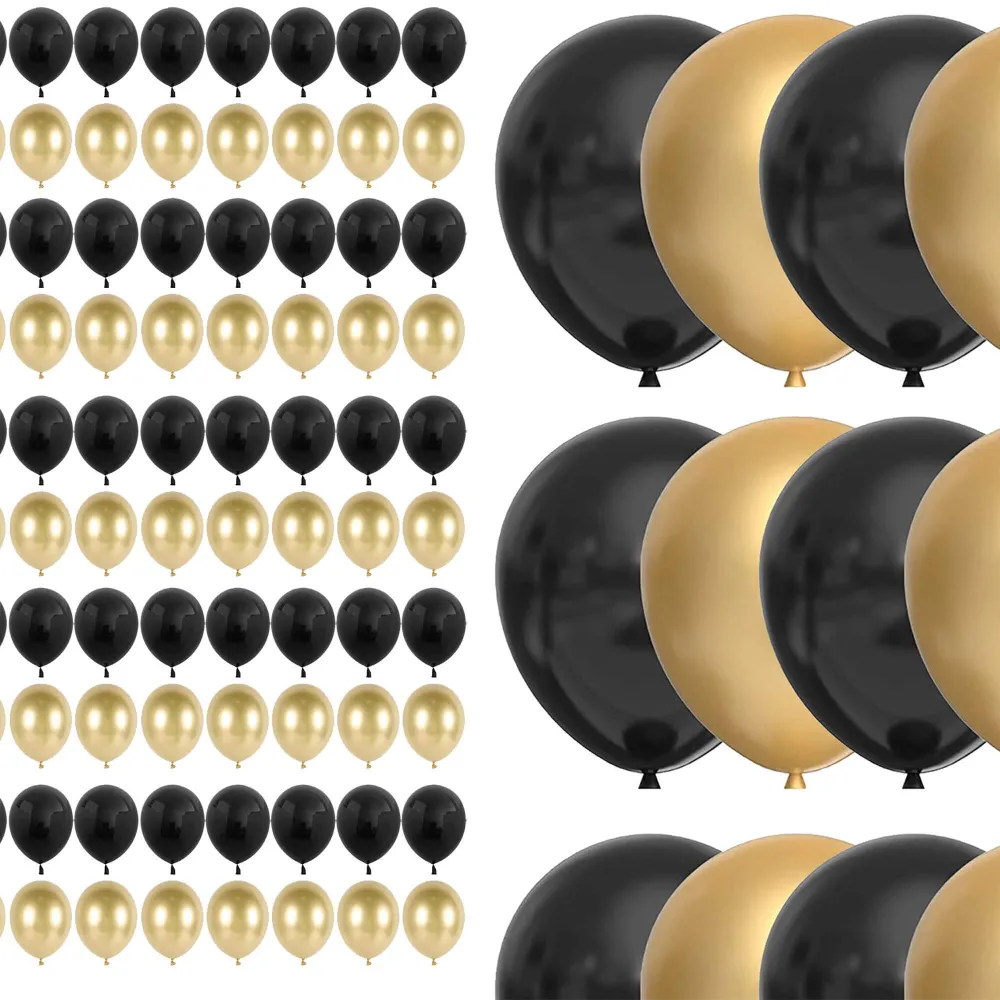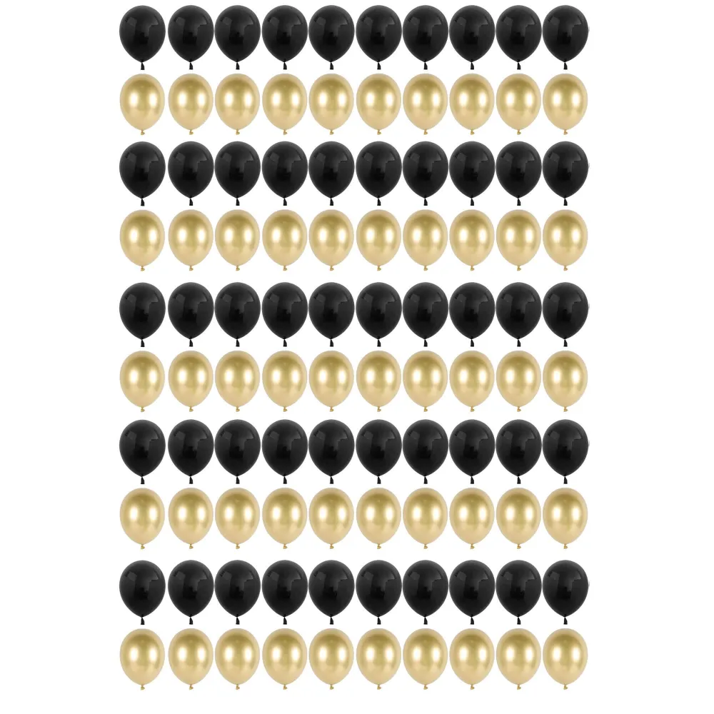 Štýlová sada 100 latexových balónikov v čiernej a zlatej farbe vytvorí pôsobivú atmosféru na každej oslave. Hodí sa pre párty, narodeniny, výročia aj tematické akcie. Kombinácia 50 čiernych a 50 zlatých balónikov umožňuje vytvárať atraktívne dekorácie presne podľa vašich predstáv. Ideálna pre rýchlu a efektnú výzdobu.