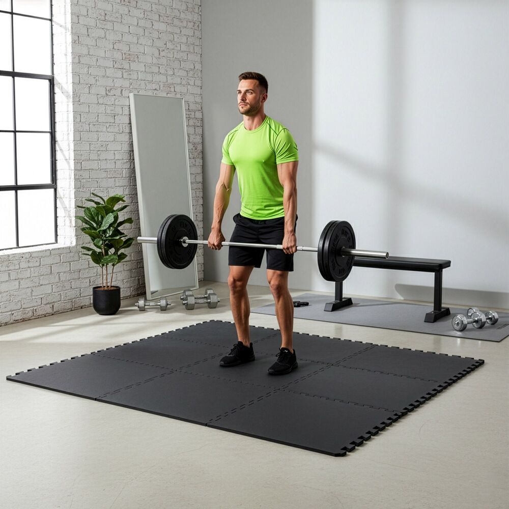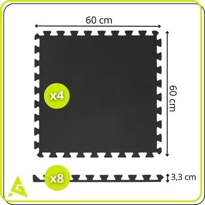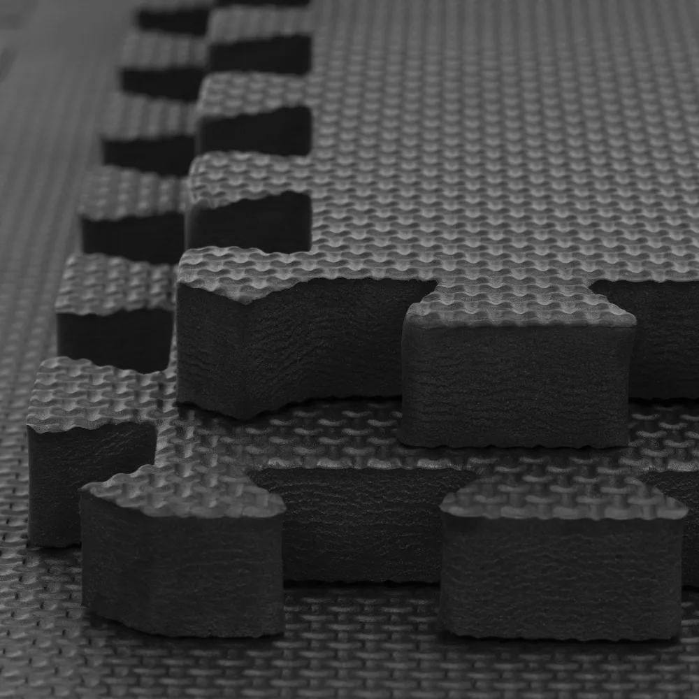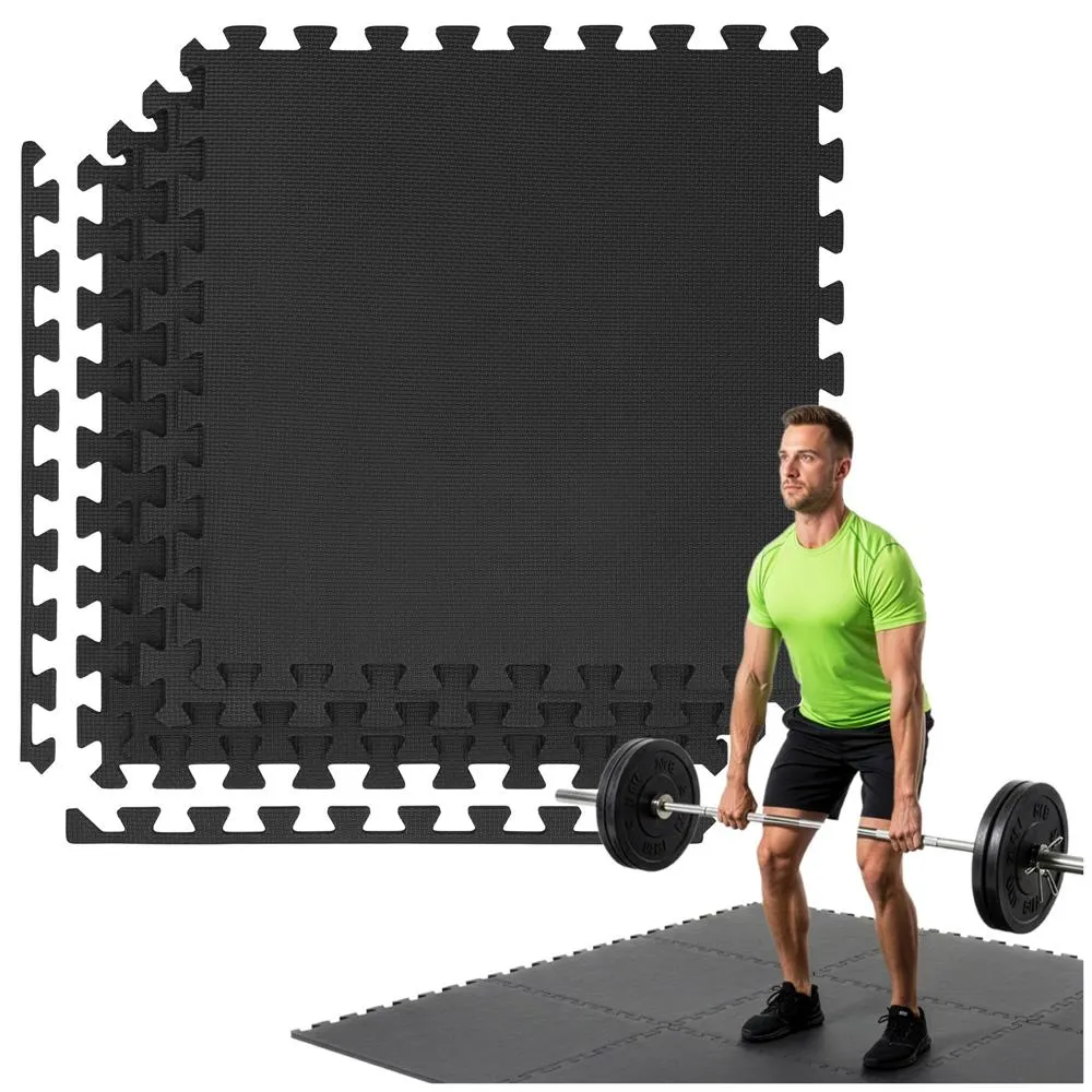 Sada 4 penových podložiek 60x60 cm pre domáci aj silový tréning. 2 cm hrubá EVA pena. Protišmykový povrch. Puzzle systém pre ľubovoľné rozšírenie plochy. Vysoké tlmenie nárazov a hluku. Ochrana podlahy pri cvičení s činkami. Certifikát CE. Jednoduchá údržba.
