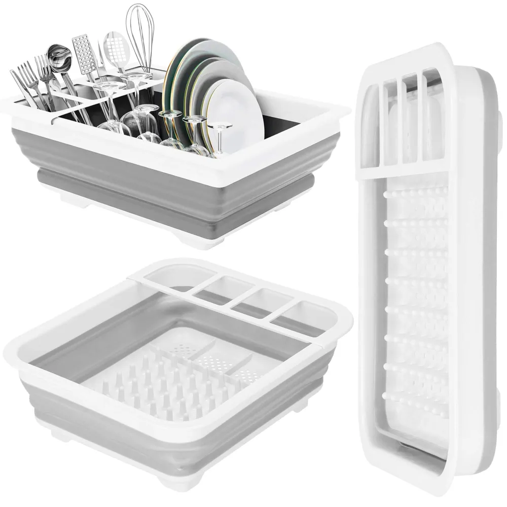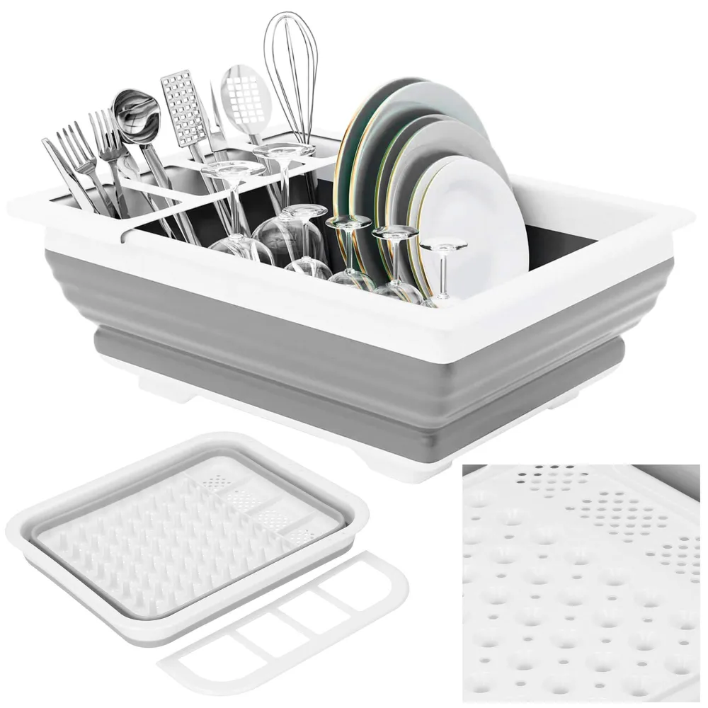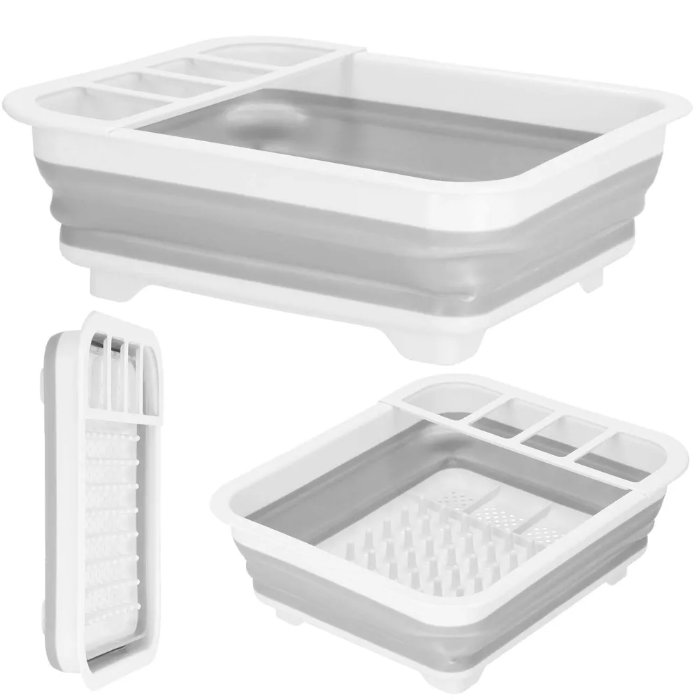 Základné informácie: Značka: Springos®. Farba; svetlo šedá; biely. Materiál: plast. Rozmery sušičky v rozloženom stave: Dĺžka: 36 cm. Šírka: 30,8 cm. Výška: 12 cm. Rozmery sušiaku naplocho: Dĺžka: 36 cm. Šírka: 30,8 cm. Výška: 5 cm. Sušička vybavená 4 menšími priehradkami a 1 väčšia. Dodatočný plastový nástavec namontovaný pomocou západiek so 4 priehradkami. Počet západiek na predĺženie: 8. Dodatočné informácie: Spodná časť sušičky je vybavená drenážnymi otvormi.