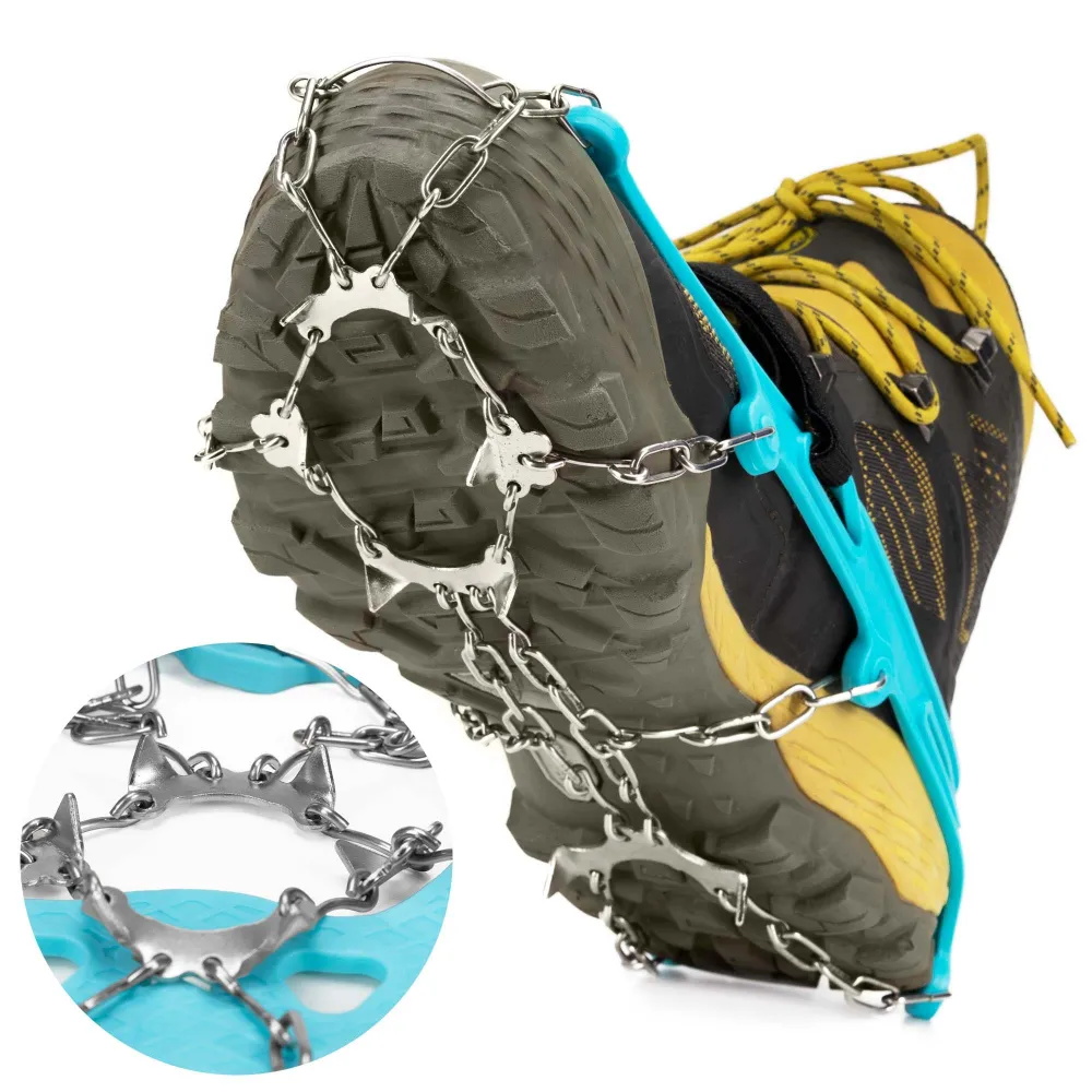 Základné údaje: Značka: Springos®. Materiál hrotu: nerezová oceľ. Gumový materiál: TPE. Farba: tyrkysová, strieborná. Veľkosť: L. Veľkosti topánok: 40 - 45. Počet hrotov: 16. Počet hrotov na topánku: 8. Počet rakov: 2. Rozteč hrotov: 6 vpredu, 2 vzadu. Rozmery: Dĺžka: 20 - 32 cm. Šírka: 9 - 12 cm. Hrúbka gumy: 5 mm. Dĺžka hrotu: 1,3 cm. Priemer krytu: cca 13 cm. Stabilizačné popruhy: 31 x 2 cm. Ďalšie informácie: Obálka zdobí logo Springos®.. Sada obsahuje dva stabilizačné popruhy na suchý zips, ktoré si musíte nainštalovať sami.. Kryt sa zapína popruhom so sťahovacou šnúrkou. Mačky sa prispôsobia tvaru topánky.