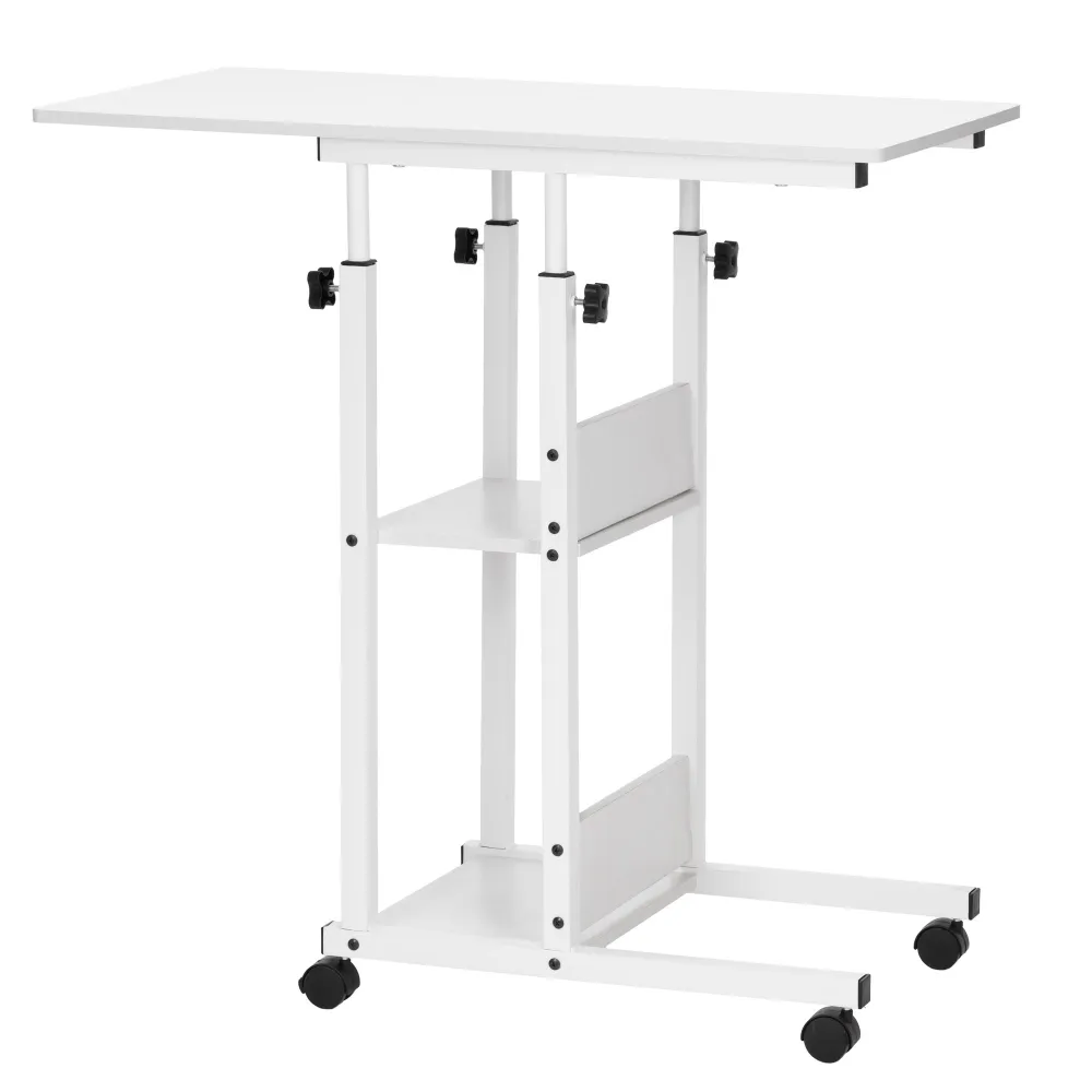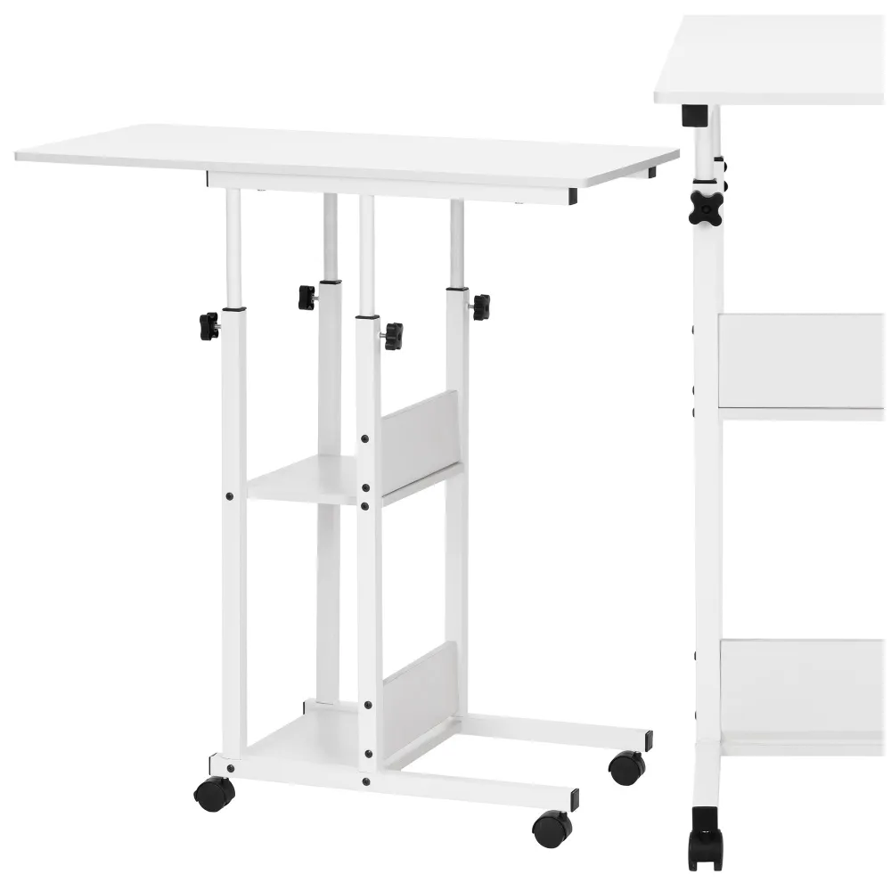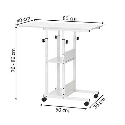 Mobilný stôl na kolieskach s výškovým nastavením 76–86 cm, ktorý ľahko prispôsobíte každej situácii. Stolík je ideálny do pracovne, spálne alebo obývačky. Výborný ako pc, konferenčný či odkladací stolík. Vďaka kolieskam s aretáciou sa ľahko premiestňuje a bezpečne stojí na mieste. Dve spodné police poskytujú ďalší úložný priestor. Odolná MDF doska a stabilná kovová konštrukcia zaisťuje pevnosť. Šírka 80 cm, hĺbka 40 cm, nastaviteľná výška 76 až 86 cm. Nosnosť 20 kg.