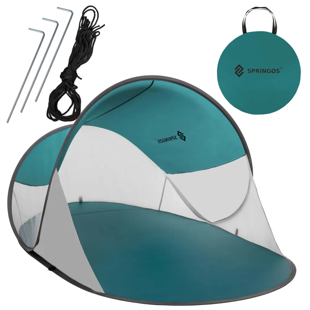 Samorozkladací plážový stan SPRINGOS TEXAS zeleno-sivý je ideálnym riešením pre pohodlný pobyt na pláži, pri vode alebo na záhrade. Vďaka POP-UP systému sa stan sám rozloží v priebehu niekoľkých sekúnd, bez nutnosti zložitej montáže. Ponúka veľké rozmery 120×190×100 cm , takže poskytne dostatok priestoru pre odpočinok aj úschovu vecí. Stan má vodeodolnú podlahu , UV filter 50+ a flexibilnú sklolaminátovú konštrukciu , ktorá zaisťuje odolnosť voči vetru a vlhkosti.