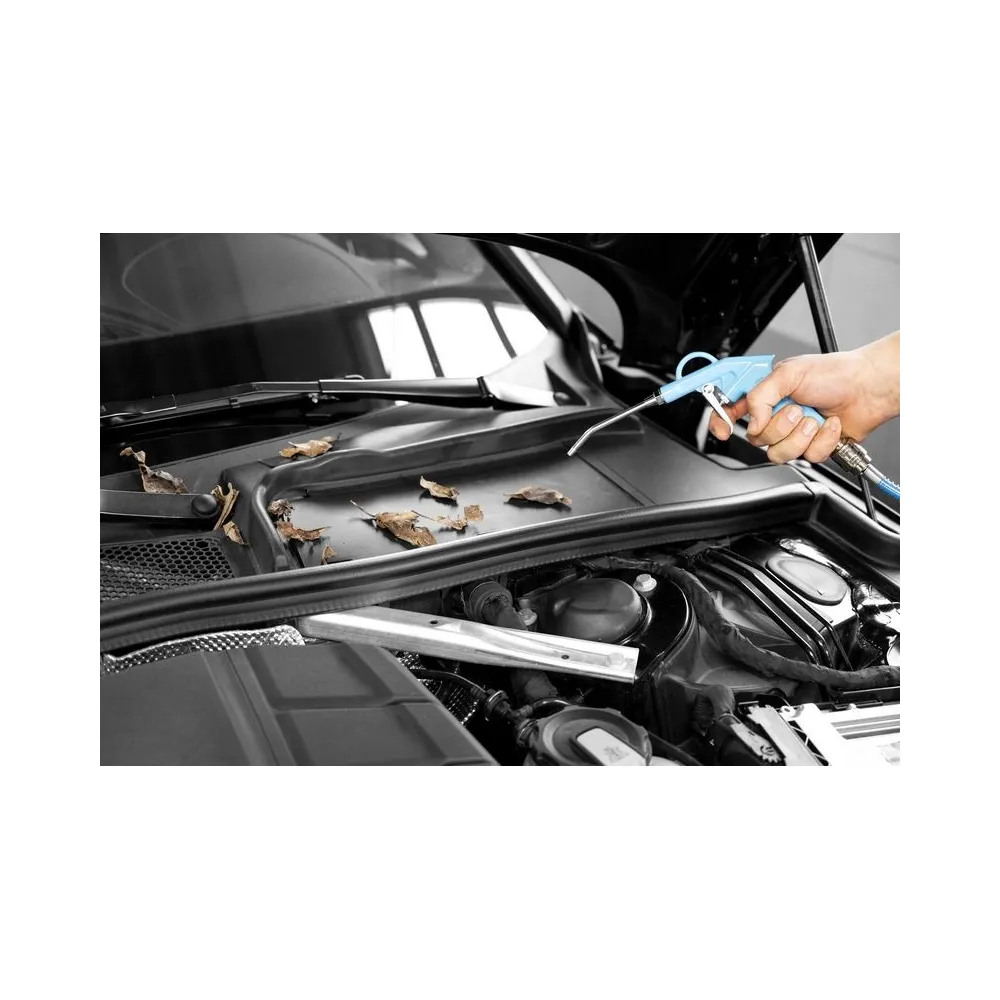 Stredne dlhá pneumatická vyfukovacia pištoľ z tlakovo liateho hliníka, na čistenie, vyfukovanie dutín a podobne. Prípojná vsuvka.