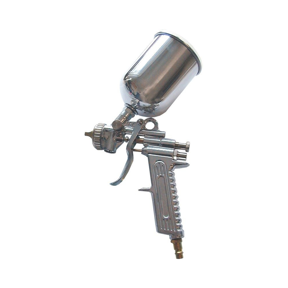 Striekacia pištoľ so spádovou nádobkou a pištoľovou rukoväťou z hliníka, regulácia farby a objem vzduchu na rukoväti, kovové veko na nádobke, prípojná vsuvka.