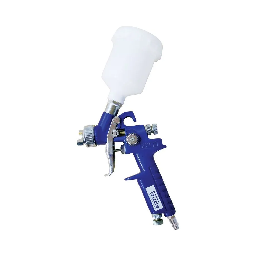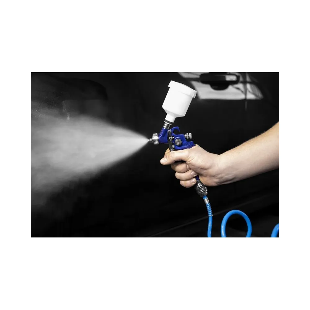 Malá nízkotlaková striekacia pištoľ z hliníka so spádovou nádobkou z plastu a technológiou HVLP, na lakovnícke práce menšieho rozsahu, dizajnové lakovanie, drobné opravy a podobne. HVLP (redukcia množstva odrážanej náterovej hmoty použitím nízkeho rozprašovacieho tlaku), možnosť nastavenia kruhového/plochého nástreku, dvojitá (základná/jemná) regulácia stlačeného vzduchu, plynulé dávkovanie farby. Prípojná vsuvka.