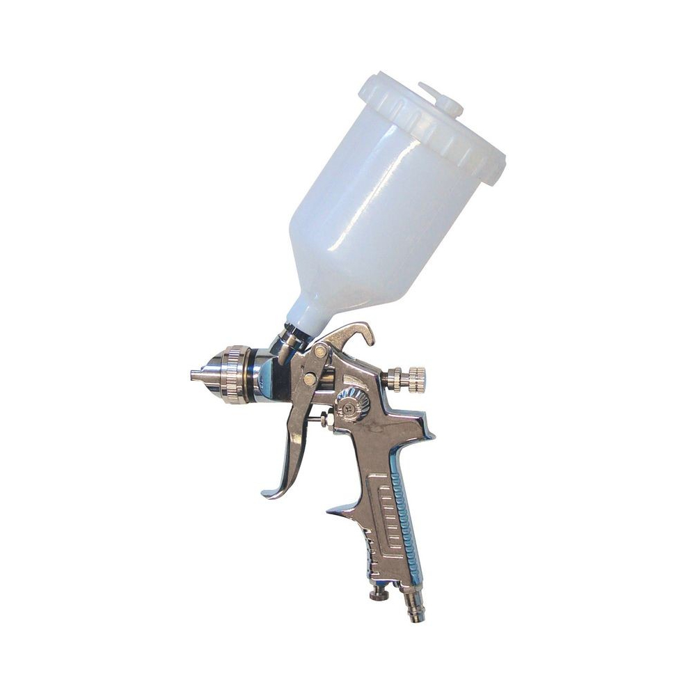 Profesionálna striekacia pištoľ s plastovou spádovou nádobkou a technológiou HVLP, vhodná pre všetky lakýrnické práce - aplikácia lakov, akrylátov, polyuretánu, epoxidu, plničov, smaltov alebo glazúr. HVLP (jemné rozprašovanie náterovej hmoty - maximálna prenosová účinnosť - úspora nanášaného materiálu), regulovateľné množstvo náterovej hmoty/stlačeného vzduchu aj typu nástreku (kruhový/plochý). Korpus pištole a nádobka z lešteného hliníka, čistiaca kefka, servisný kľúč, vsuvka.