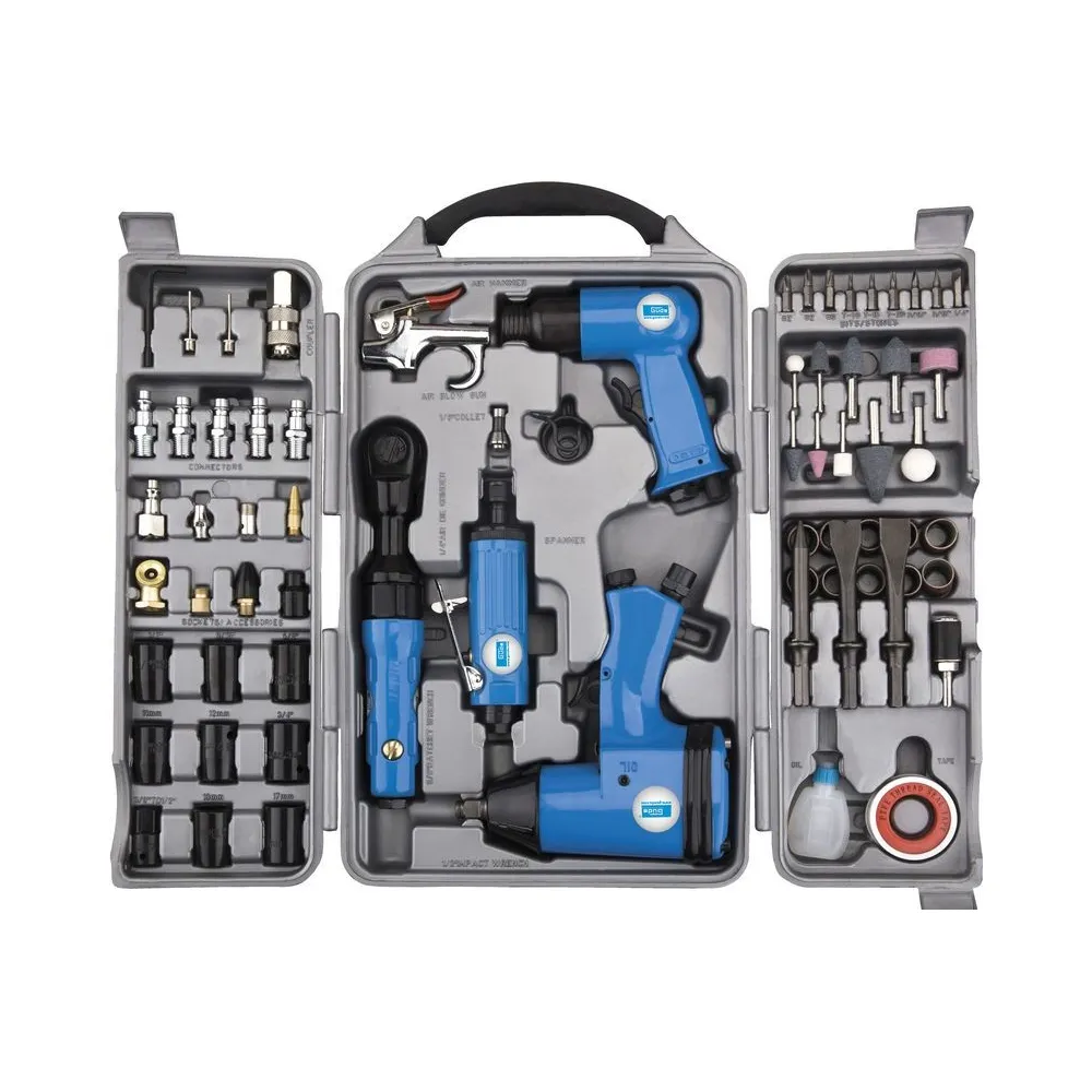 Pneumatické náradie s príslušenstvom v plastovom boxe s možnosťou pripevnenia na stenu, sada obsahuje základné pneumatické náradie do dielne: rázový uťahovač 1/2", račňový uťahovač 3/8", búracie kladivo, priamu brúsku 6 mm, mini pneumatickú pisto. Príslušenstvo: 8 nástrčkových orechov, 3 sekáče, prídržná pružina k búraciemu kladivu, klieština 3 mm, 3 brúsne nástavce 6 mm, 5 brúsnych nástavcov 3 mm, upínanie brúsnej dutinky 6 mm, 10 brúsnych dutín, 10 brúsnych dutín 5 vsuviek 1/4" AG, 1 vsuvka 3/8" IG, upnutie ventilu, imbusový kľúč 5 mm, nádobka na olej, tesniaca páska, vidlicový kľúč, hadicová spojka 3/8" IG.