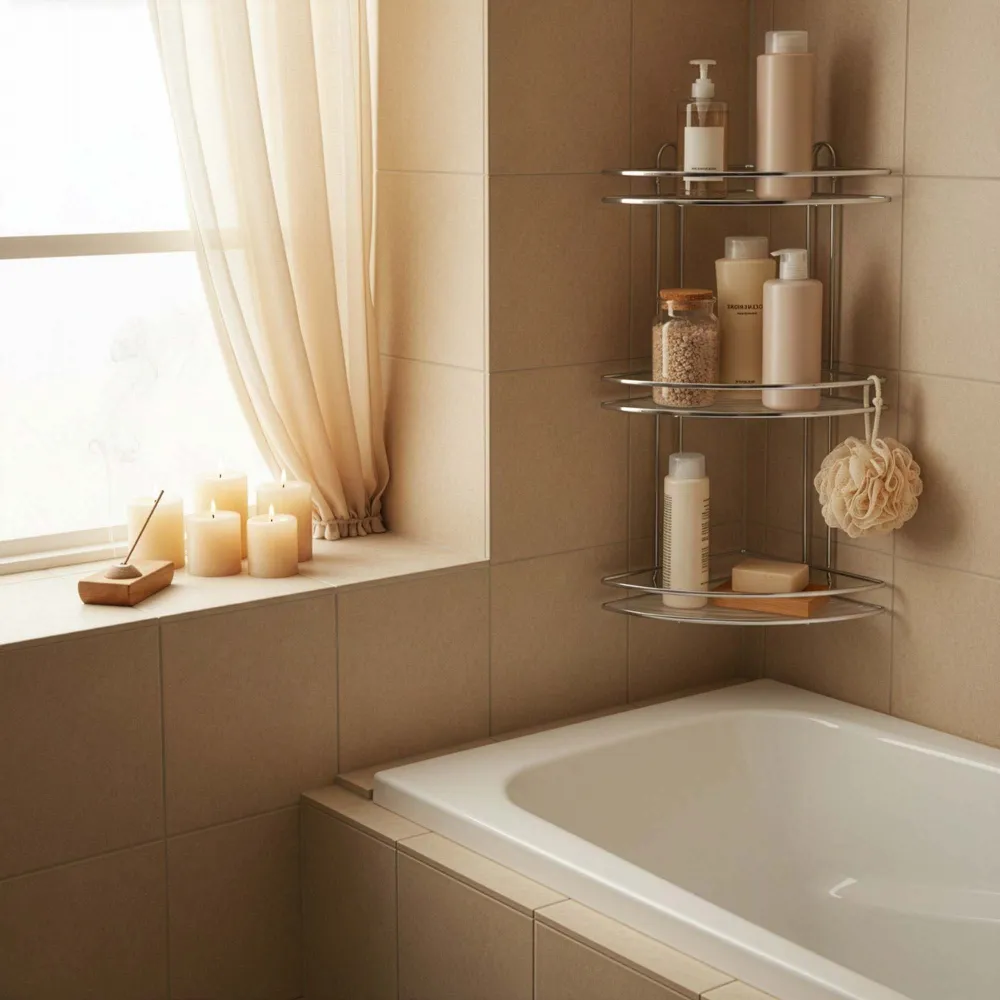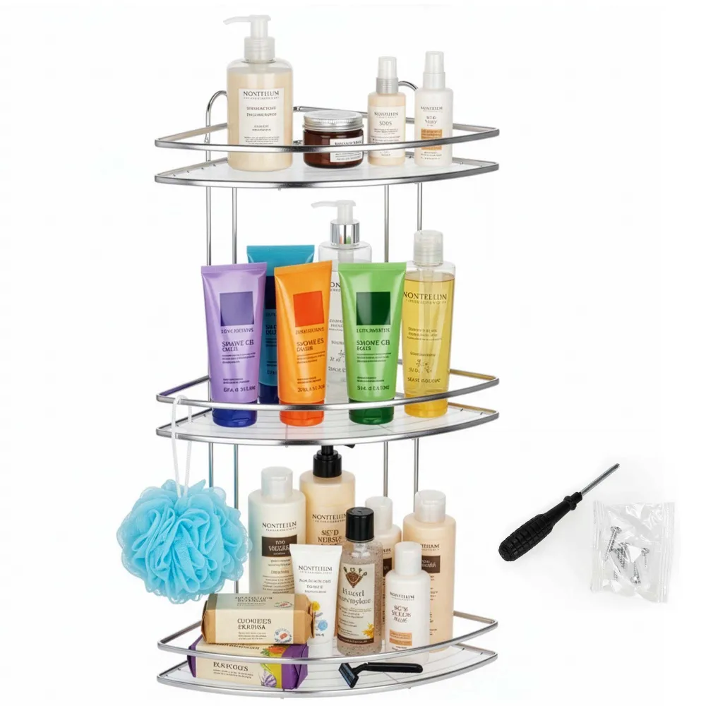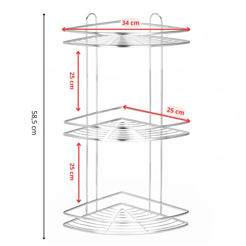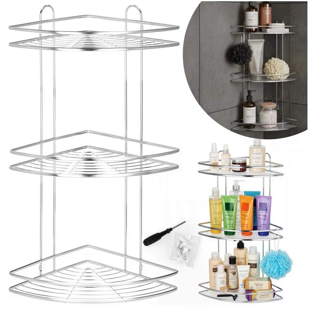 Polička do kúpeľne SPRINGOS HA7542 strieborná je praktickým a elegantným riešením na usporiadanie kozmetiky i drobných doplnkov. Vďaka trojuholníkovému tvaru efektívne využíva roh kúpeľne, takže sa skvele hodí aj do menších priestorov. Trojposchodové prevedenie poskytuje dostatok miesta a umožňuje prehľadné uloženie všetkých potrieb. Kovová konštrukcia v lesklom striebornom prevedení pôsobí moderne a zároveň odolne. Veľkou výhodou je jednoduchá montáž , ktorú uľahčuje priložený skrutkovač a montážne príslušenstvo. Otvorený dizajn navyše zaisťuje rýchle vysychanie a obmedzuje usadzovanie vlhkosti.