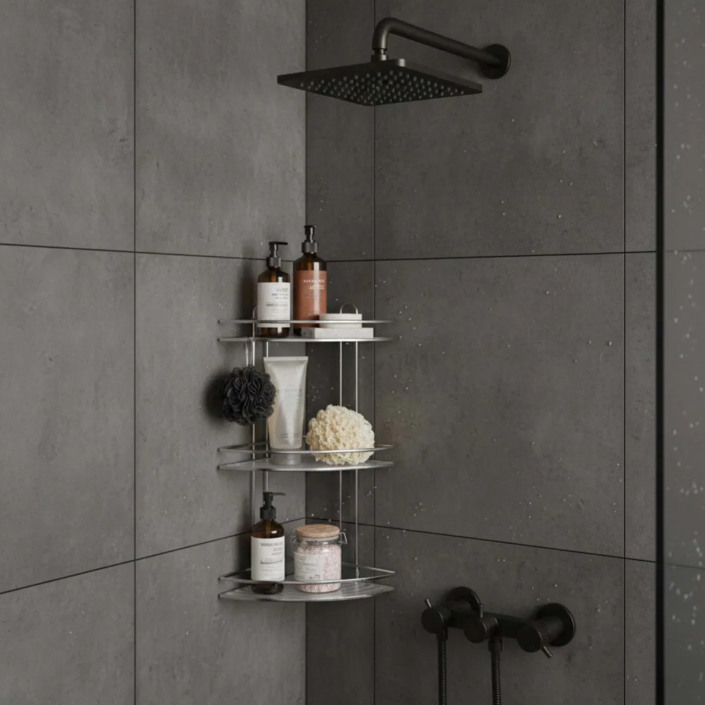 Strieborná rohová polička skvele využije priestor v kúpeľni a ponúkne tri úrovne na usporiadanie kozmetiky i doplnkov. Kovová konštrukcia pôsobí elegantne, je odolná a vďaka otvorenému designu umožňuje rýchle vysychanie. Inštalácia je jednoduchá vďaka priloženým montážnym prvkom. Praktické rozvrhnutie , stabilné prevedenie a nadčasový vzhľad dodajú kúpeľni štýl aj poriadok.