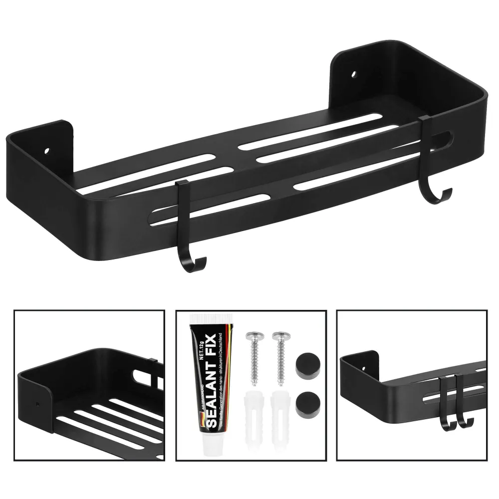 Elegantná polička so šírkou 32,5 cm, ktorá nevyžaduje vŕtanie do steny . Špeciálny design v matnej čiernej farbe. Kompaktná veľkosť. Otvory na odvádzanie vody, prídavné vešiaky na zavesenie doplnkov. Pevný a odolný materiál, jednoduchá údržba. 2 spôsoby uchytenia, montážne prvky v balení. Vhodný doplnok do kúpeľne či kuchyne.