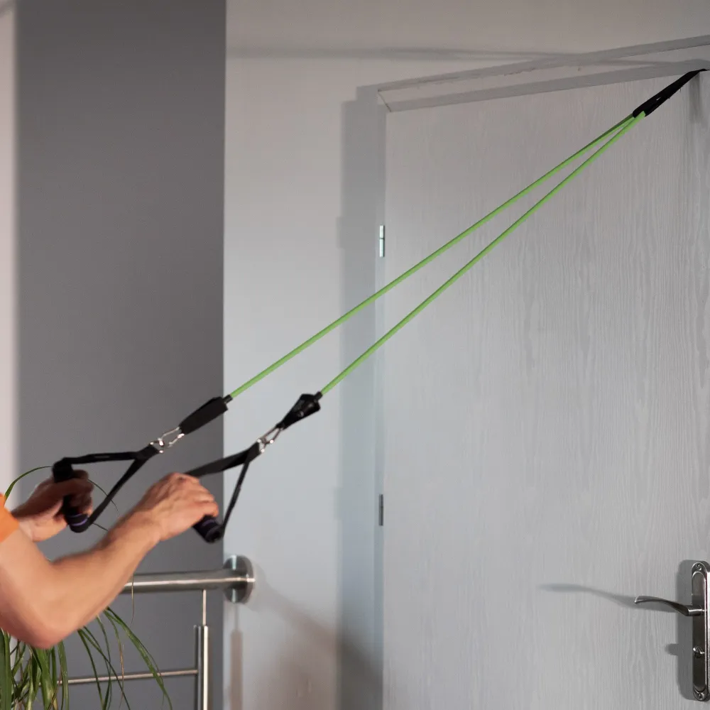 Systém odporových gúm umožňuje individuálne nastavenie záťaže a zapojenie rôznych svalových skupín. Pomocou priložených komponentov je možné vykonávať cviky na ruky, chrbát, nohy, ramená aj stred tela. Ideálne riešenie pre domáci tréning, fitness aj rehabilitáciu bez nutnosti veľkého vybavenia.