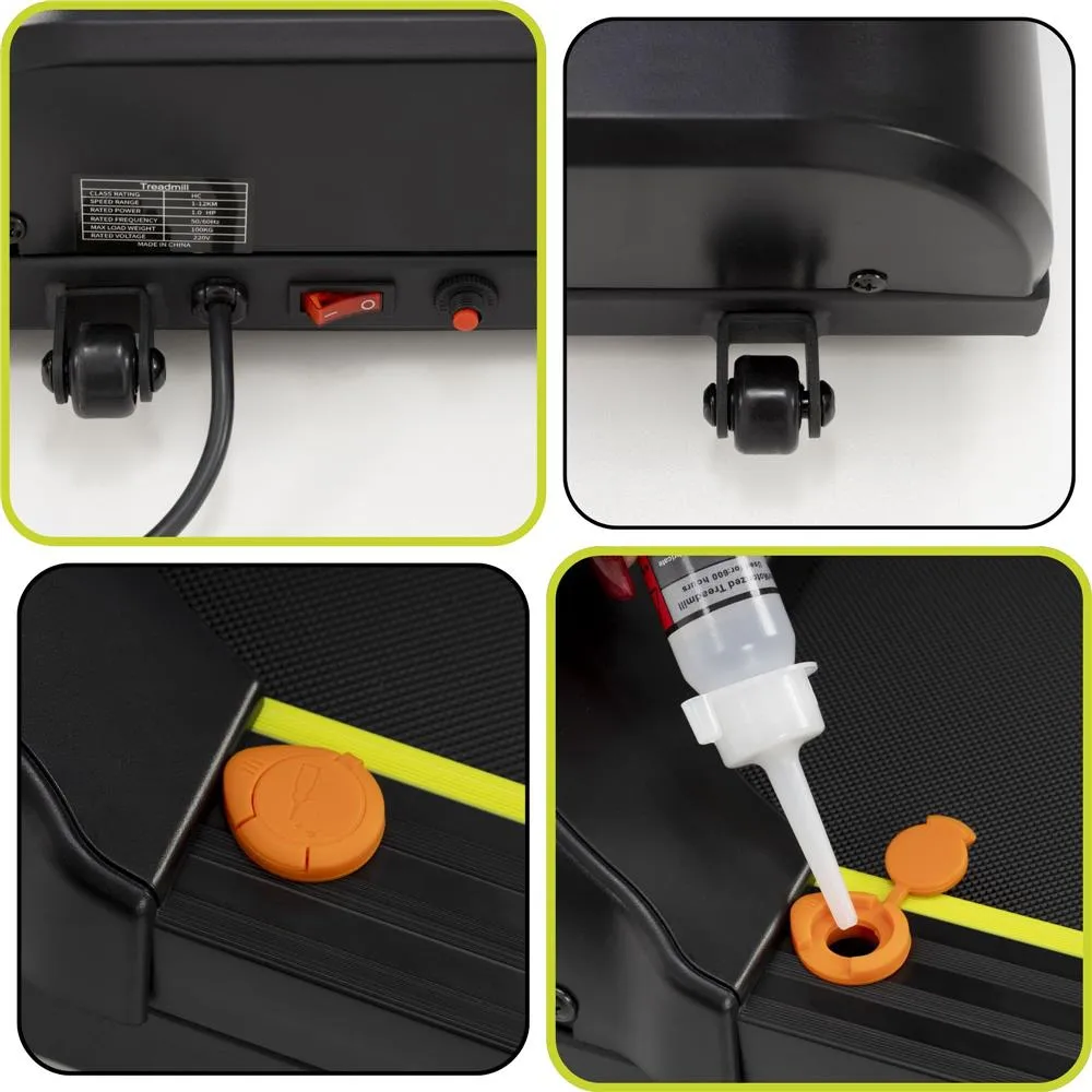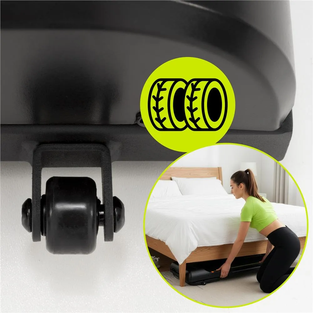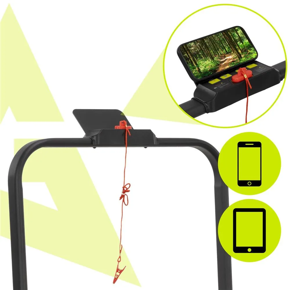 Bežecká plocha má protišmykový povrch a podložky zaisťujú stabilitu pri behu. O bezpečnosť sa stará magnetický bezpečnostný kľúč , ktorý pás pri vytiahnutí okamžite zastaví. Nechýbajú transportné kolieska pre ľahké premiestnenie. Vďaka skladnému prevedeniu je možné pás ľahko zasunúť pod posteľ alebo pohovku . Nosnosť je 110 kg, spĺňa certifikácie CE a RoHS .