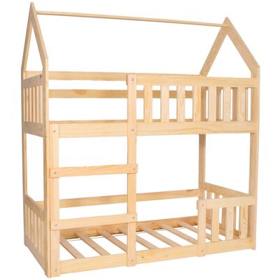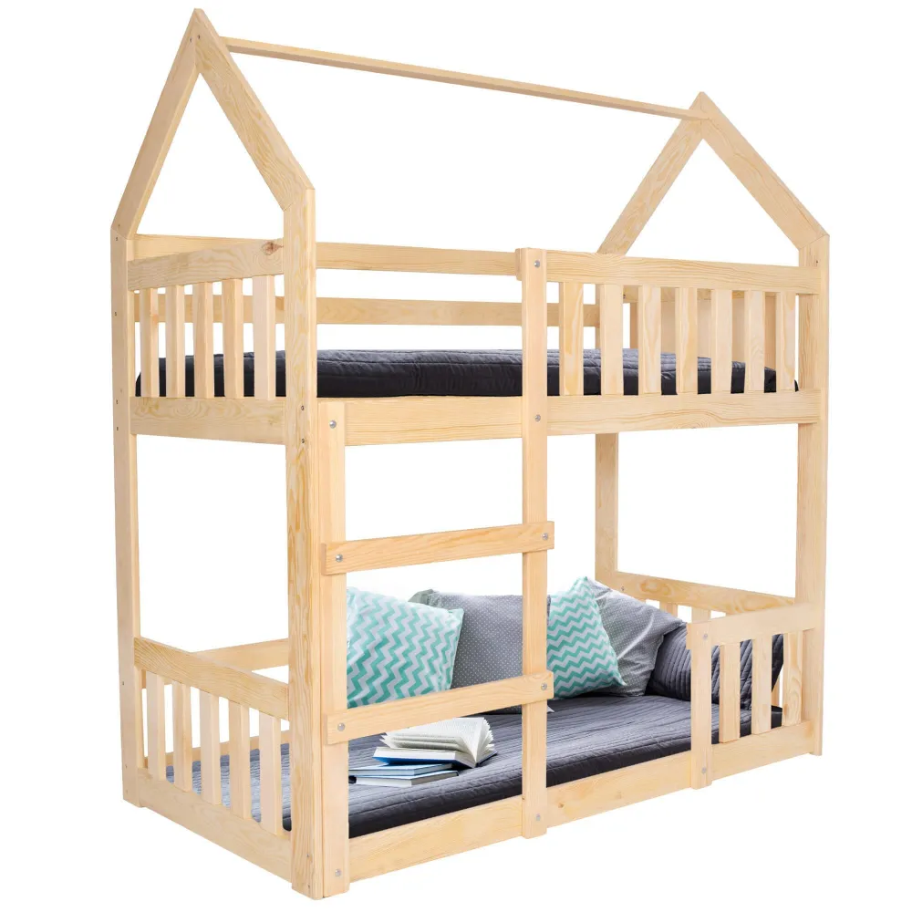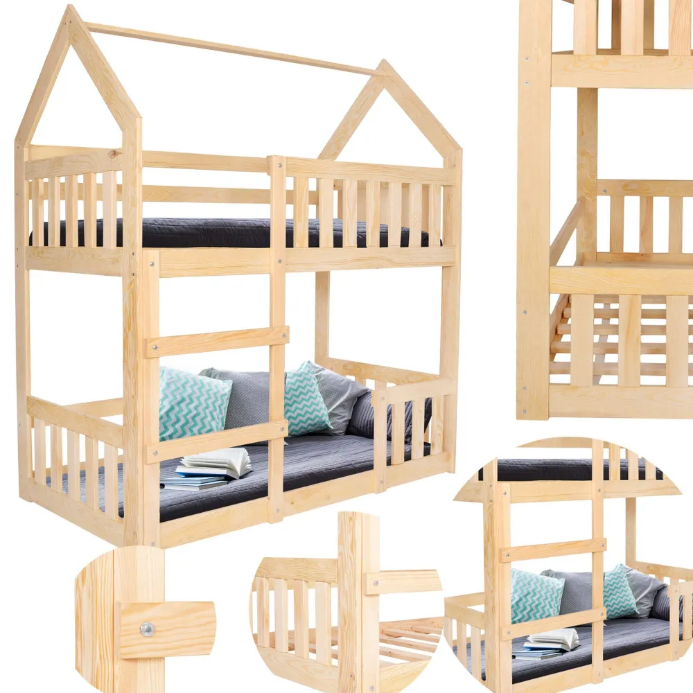 Drevená poschodová posteľ v tvare domčeka poskytne bezpečné a útulné miesto pre spánok aj hranie. Vďaka pevnej konštrukcii z kvalitného borovicového dreva s precíznym opracovaním je stabilná a odolná. atmosféru. Súčasťou balenia sú lamelové rošty. Rozmery lôžka: 2× 160×80 cm.