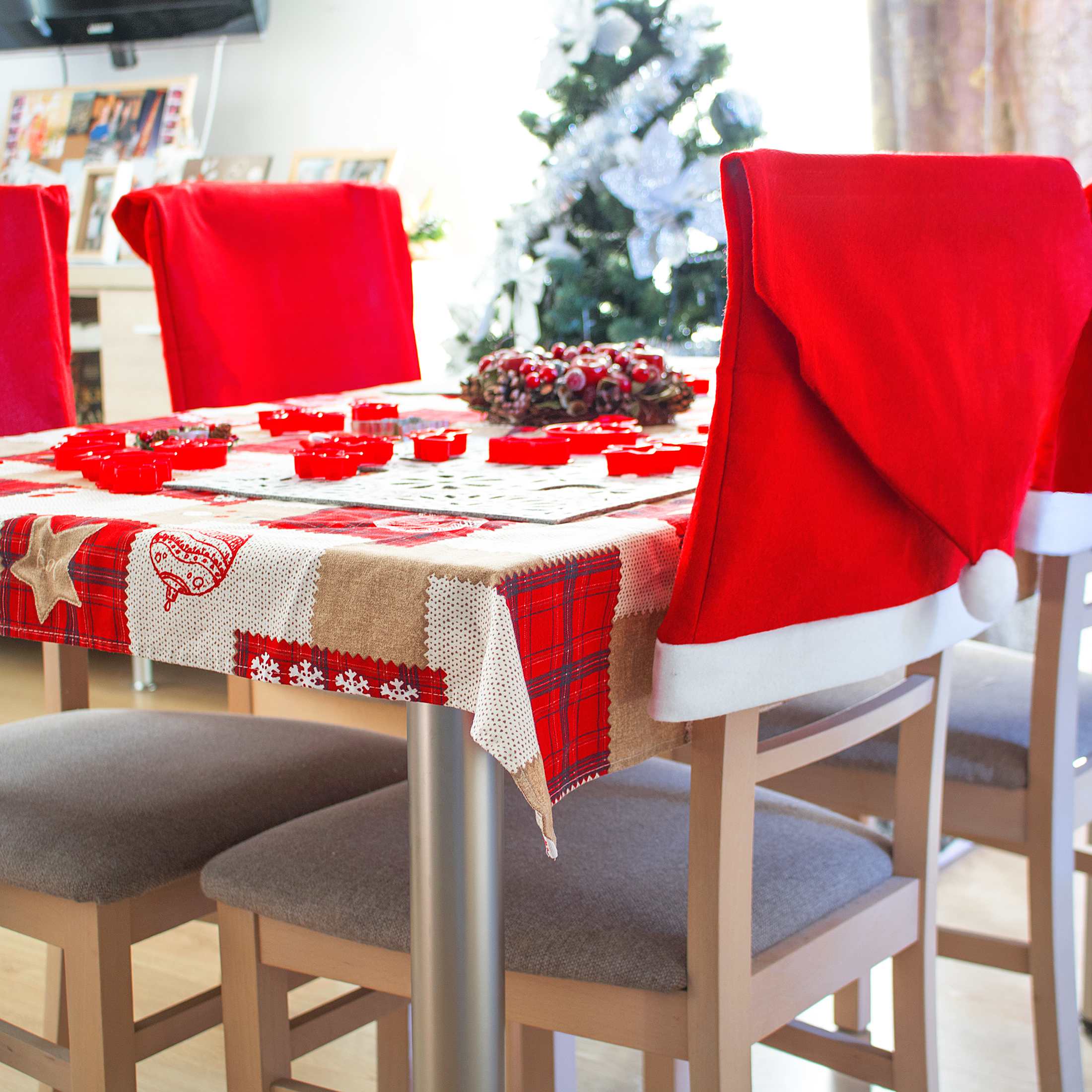 Sviatočný poťah na stoličke s vianočným motívom. Univerzálna veľkosť vhodná pre väčšinu stoličiek. Príjemný a hebký materiál s prímesou Spandexu.