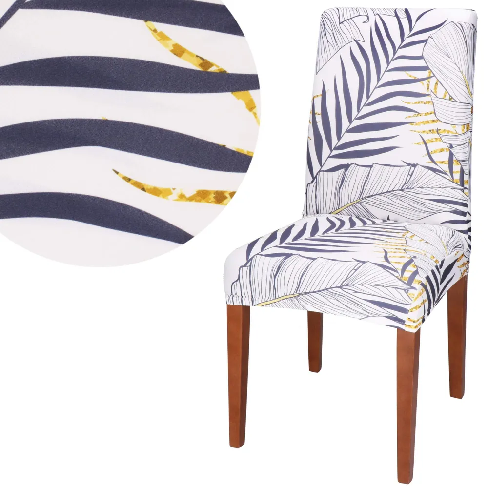 Elastický poťah na stoličke so vzorom listov v odtieňoch modrej a žltej. Napínací a univerzálny, vhodný pre všetky typy stoličiek. Vyrobený z príjemného a odolného materiálu. Jednoduché nasadenie a jednoduchá údržba. Elegantný vzhľad pre každú domácnosť.