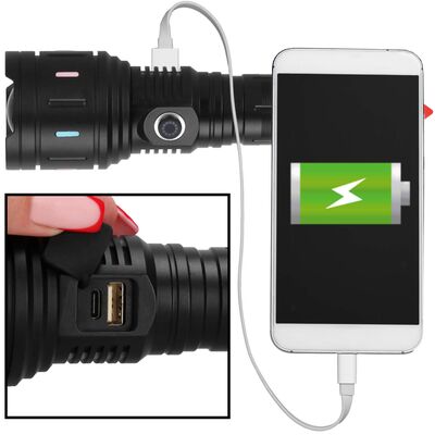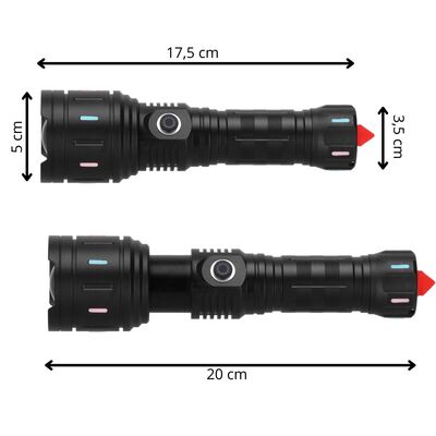 Výkonná LED dobíjacia baterka s odolným hliníkovým telom, zoomom a 5 režimami svietenia je ideálna pre náročné použitie. Ponúka studené biele svetlo s dlhým a silným dosahom, možnosť využitia ako powerbanka vďaka batérii 5000 mAh a dvom portom USB a USB-C. Rozbíjací hrot na konci je chránený krytom. Súčasťou balenia je praktické pútko na nosenie. Rozmery 20x5 cm.