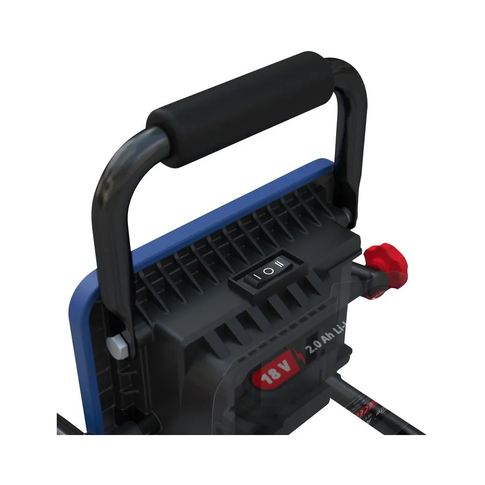 Akumulátorový LED reflektor zo série akumulátorového náradia 18V E3. Optimálne osvetlenie zaisťuje 100 výkonných SMD LED diód. 2 svetelné toky: 2000 lm alebo 4800 lm. Teplota chromatickosti 6500 K (studená biela). Individuálne nastaviteľný uhol svietenia v rozsahu 120 °.