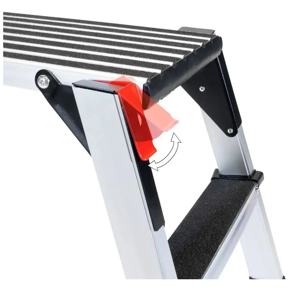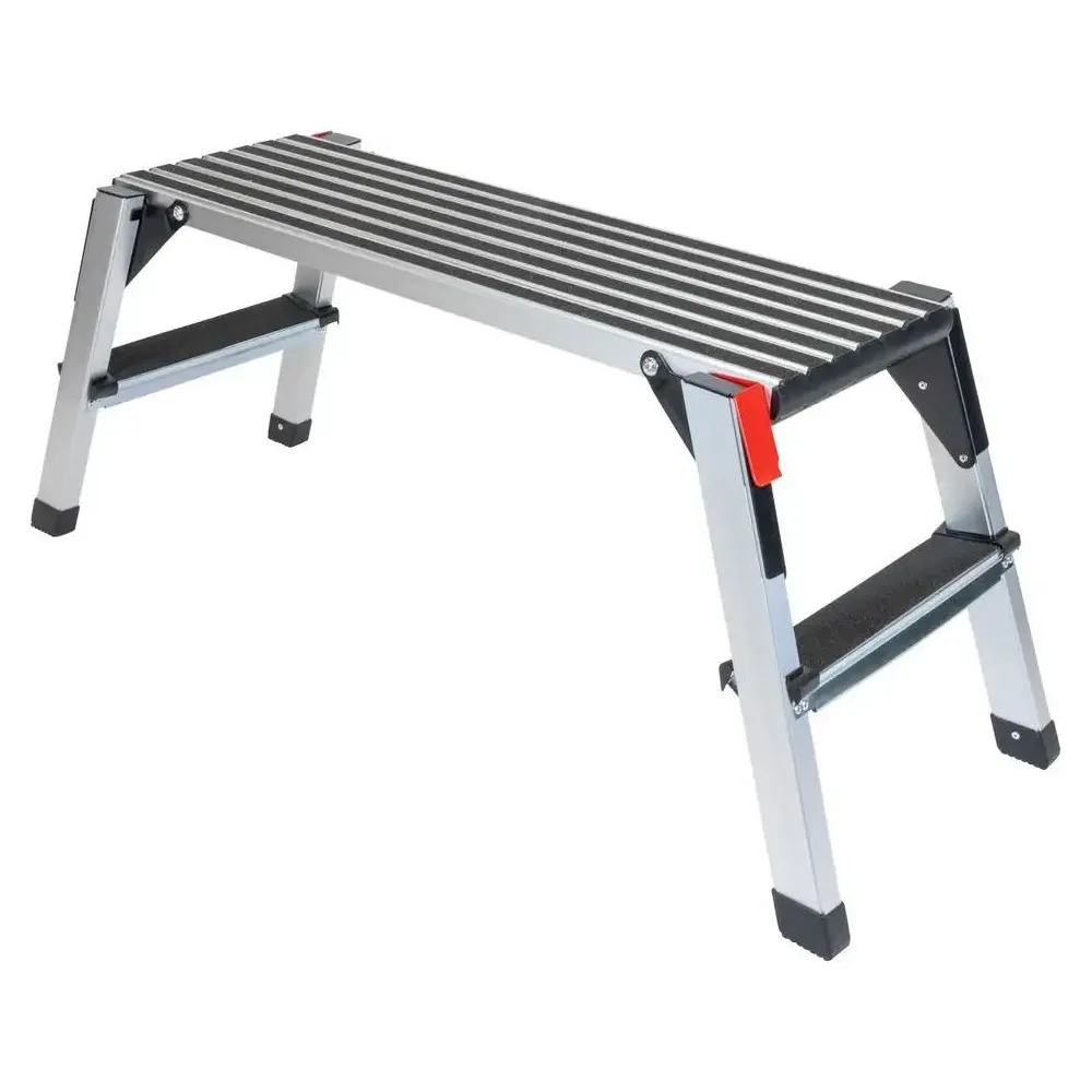 Praktická, skladacia pracovná plošina s veľkou plochou pre všetky druhy práce. Či už na stavbe alebo v domácnosti, táto ľahká hliníková plošina je nepostrádateľným pomocníkom pri montáži, renovácii alebo dekorovaní. Plošina a schodíky s protišmykovou vrstvou na bezpečné státie pri práci. Extra dlhá plocha na pohodlnú prácu. Bezpečnostný držiak na zablokovanie v rozloženom stave. Vďaka jednoduchému skladaciemu mechanizmu je možné zložiť, čím sa šetrí miesto. Gumené protišmykové nožičky.