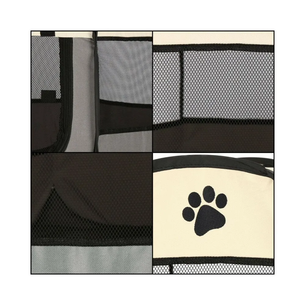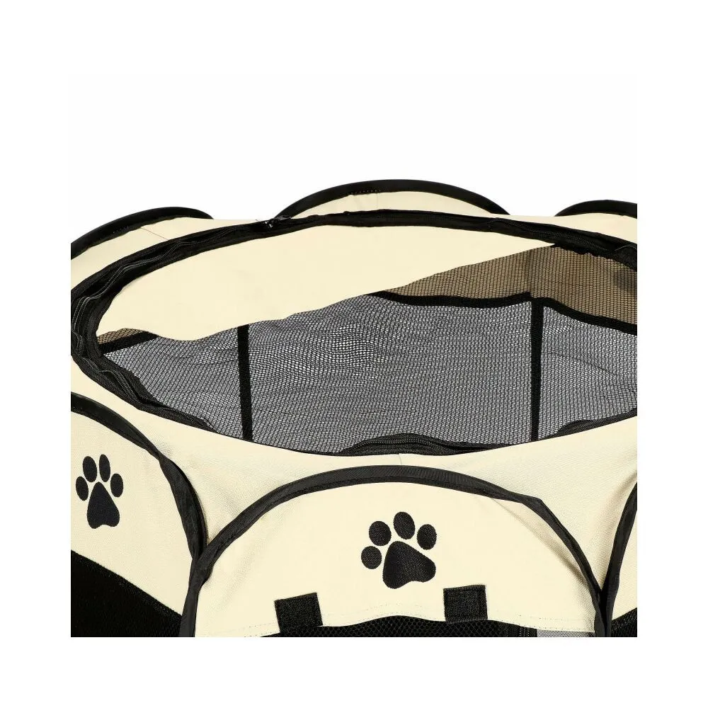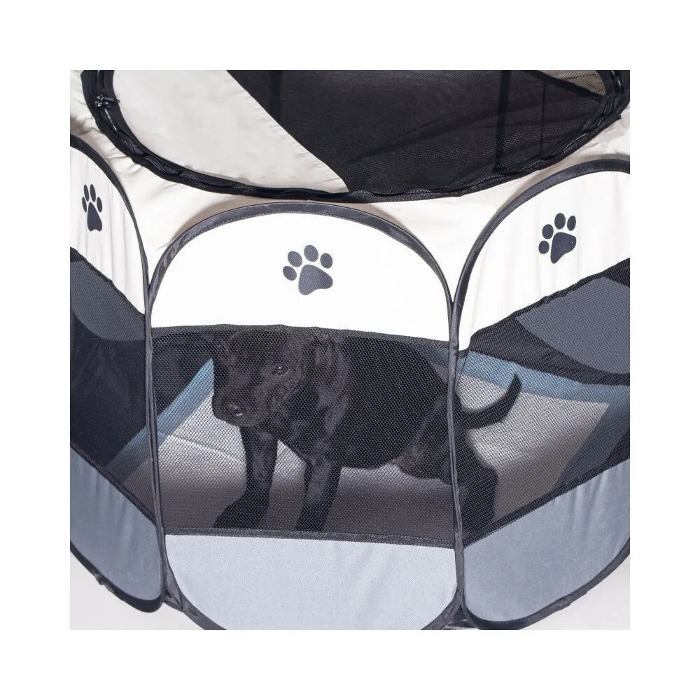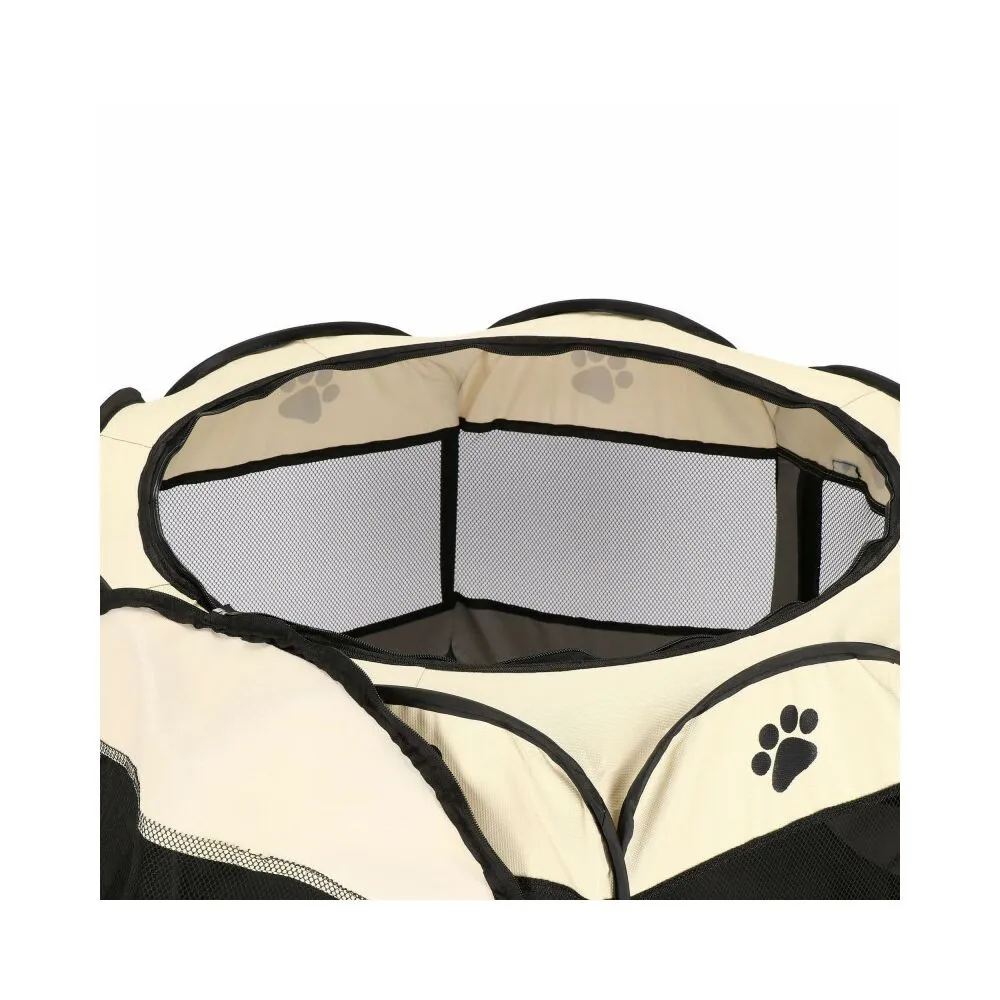Skladacia ohrádka pre psy a mačky. Rýchle a ľahké zloženie a rozloženie. Univerezálne použitie. Odolný materiál, ľahko sa čistí. Steny fungujú ako ochrana pred hmyzom, poskytujú plnú cirkuláciu vzduchu, odnímateľná strecha. Zaujímavý design, tlmené farby.