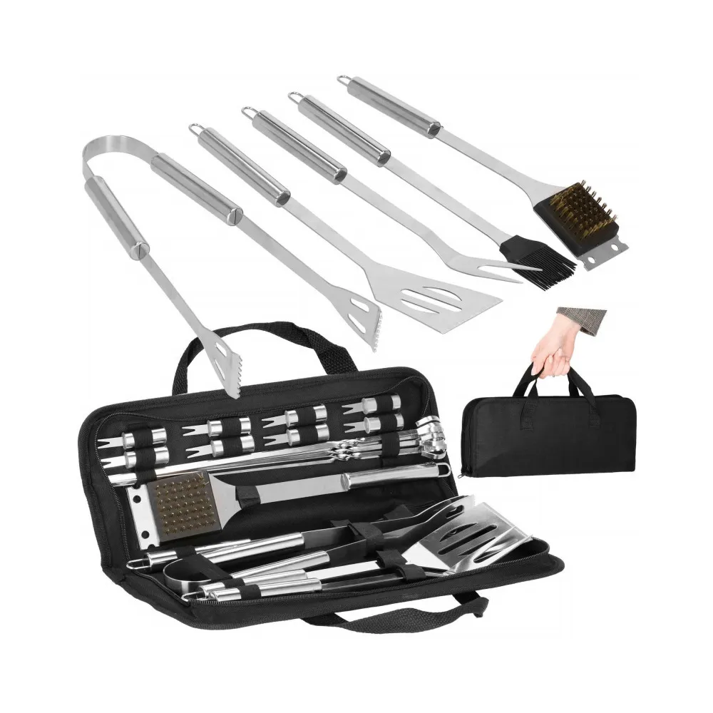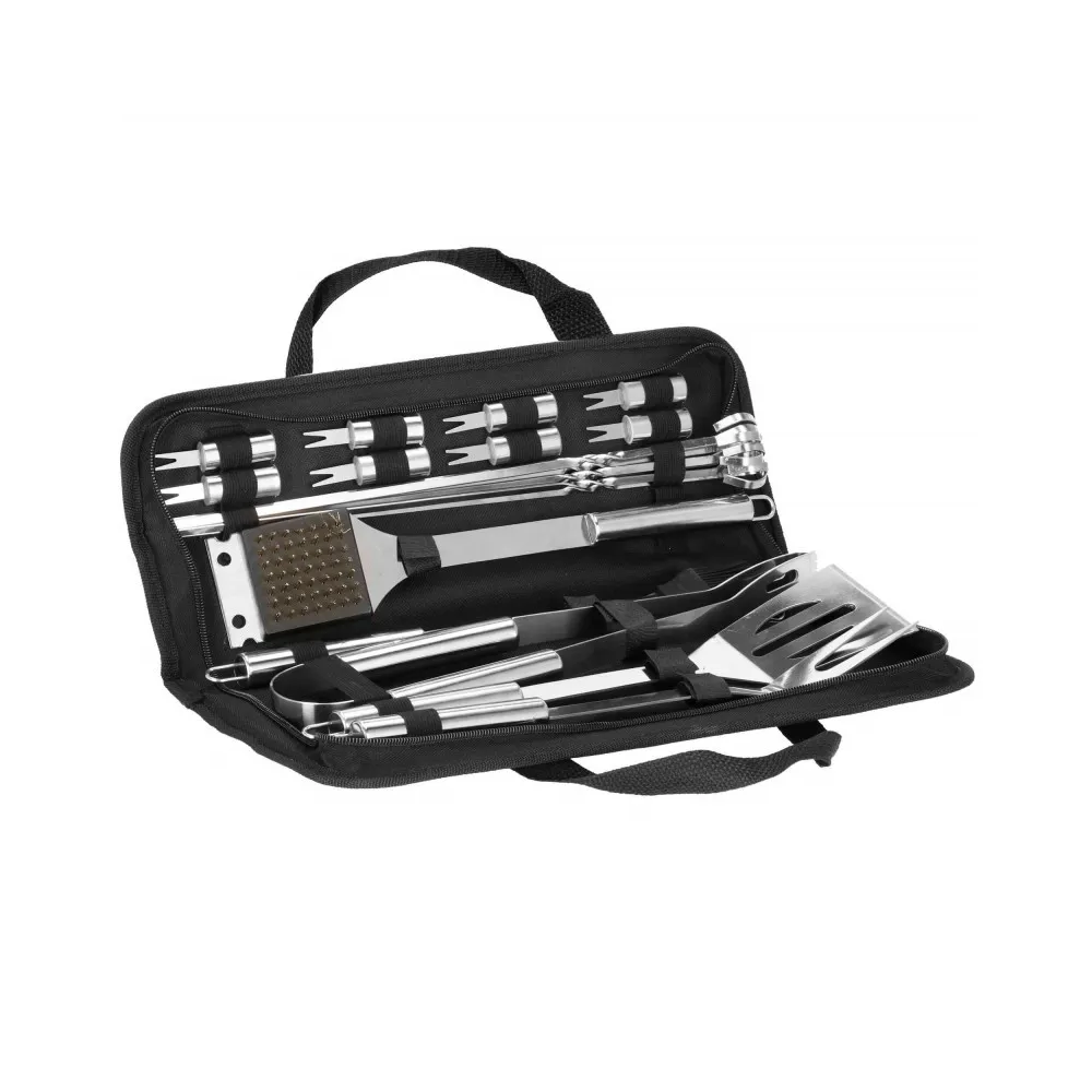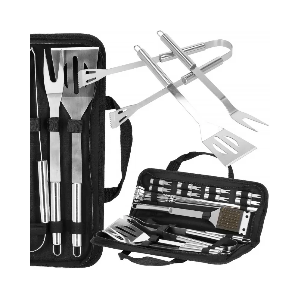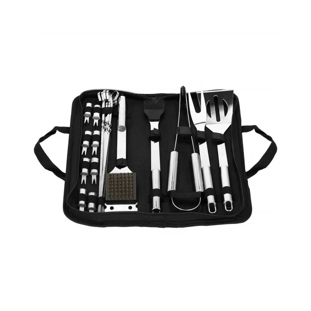 Praktická nerezová sada je vhodná na grilovanie. Pokiaľ plánujete grilovací večer, určite majte všetky potrebné doplnky. Nami ponúkaná grilovacia sada obsahuje 19ks náčinia . Nerezová oceľ, úchyty na zavesenie, ľahko sa čistí a poslúži mnoho sezón. Súprava obsahuje navyše puzdro, do ktorého pohodlne uložíte príslušenstvo bez rizika straty akéhokoľvek prvku.